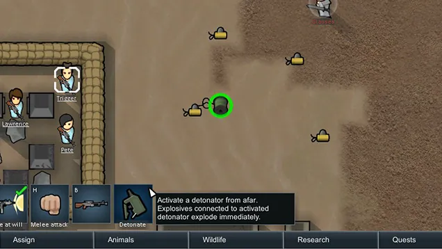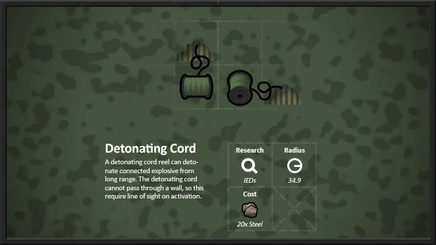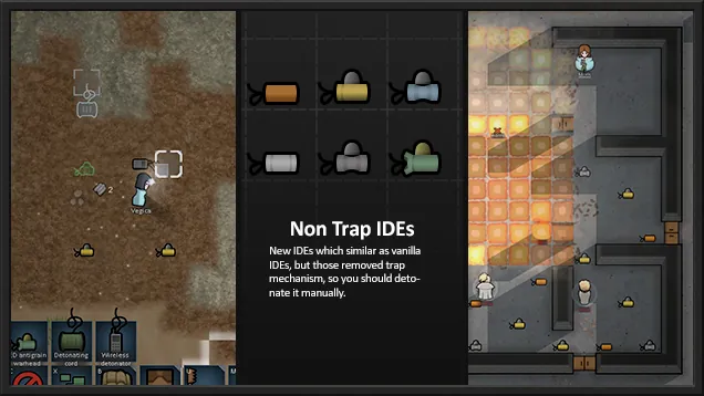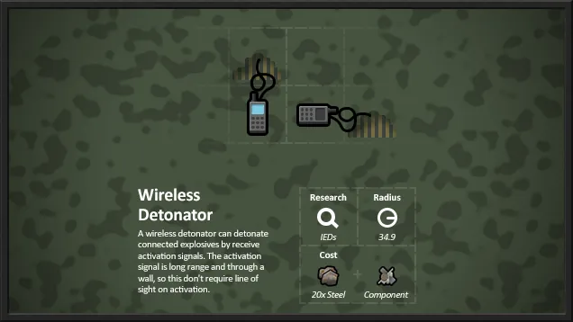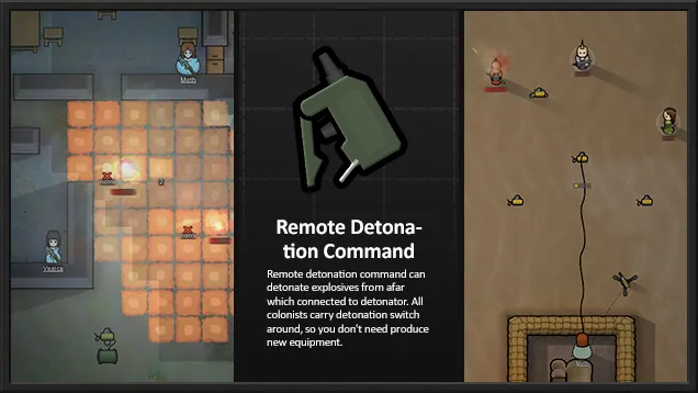入植者が爆発物を遠隔起爆できるようにします。専用の起爆装置を建設後、追加されたコマンドから起爆が行えるようになります。起爆装置はCompExplosiveをもつものならばだいたい起爆することができます。すべての入植者は起爆スイッチを携帯している設定のため、いつでもどこでも起爆装置を作動させることができます。したがって新しい装備を作ったり、装備したりする必要はありません。専用の起爆装置は研究「IDE」の履修後に建設できるようになります。