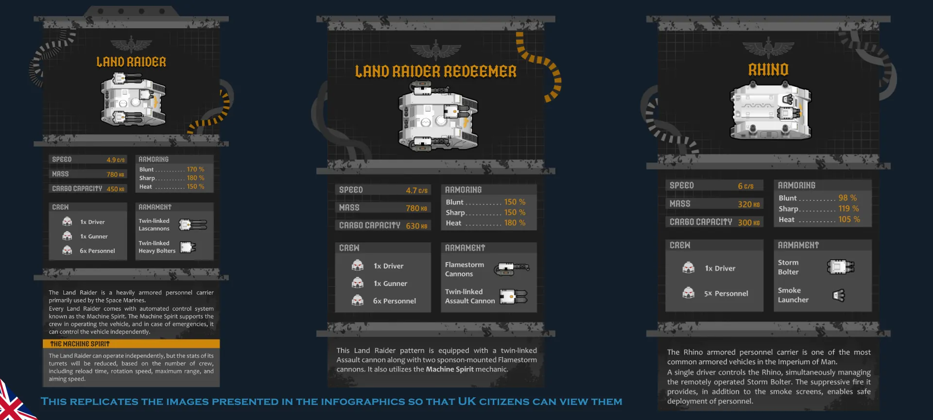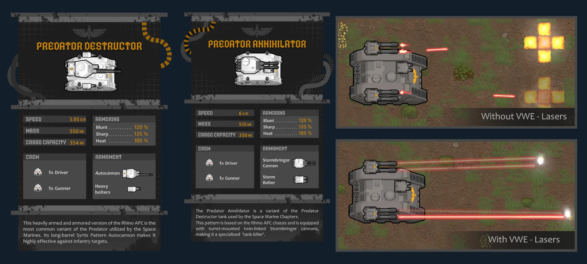 We are excited to present you with a new mod that brings five distinct Space Marine vehicles from the WARHAMMER 40.000 universe to Rimworld.