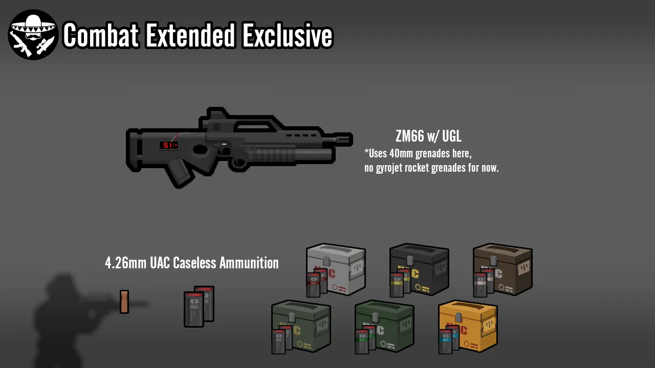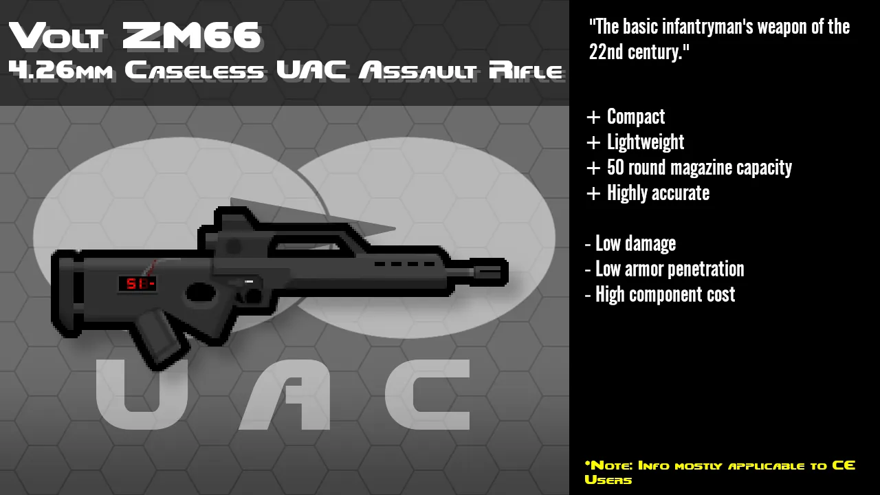 The ZM66 is extremely accurate thanks to its scope, and its bullpup design makes it compact and easy to control. It deals slightly less damage than 5.56 but has about the same armor penetration and has less recoil. Holds 50 rounds in its magazine. Uses a proprietary 4.26mm UAC Caseless cartridge.