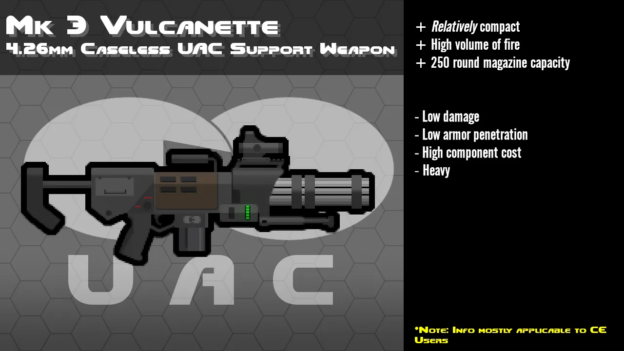 The Vulcanette is a compact, relatively lightweight handheld minigun, for use as a support weapon. Holds 250 rounds of 4.26mm, and has very light recoil. It features a bipod and a similar scope to that of the ZM66