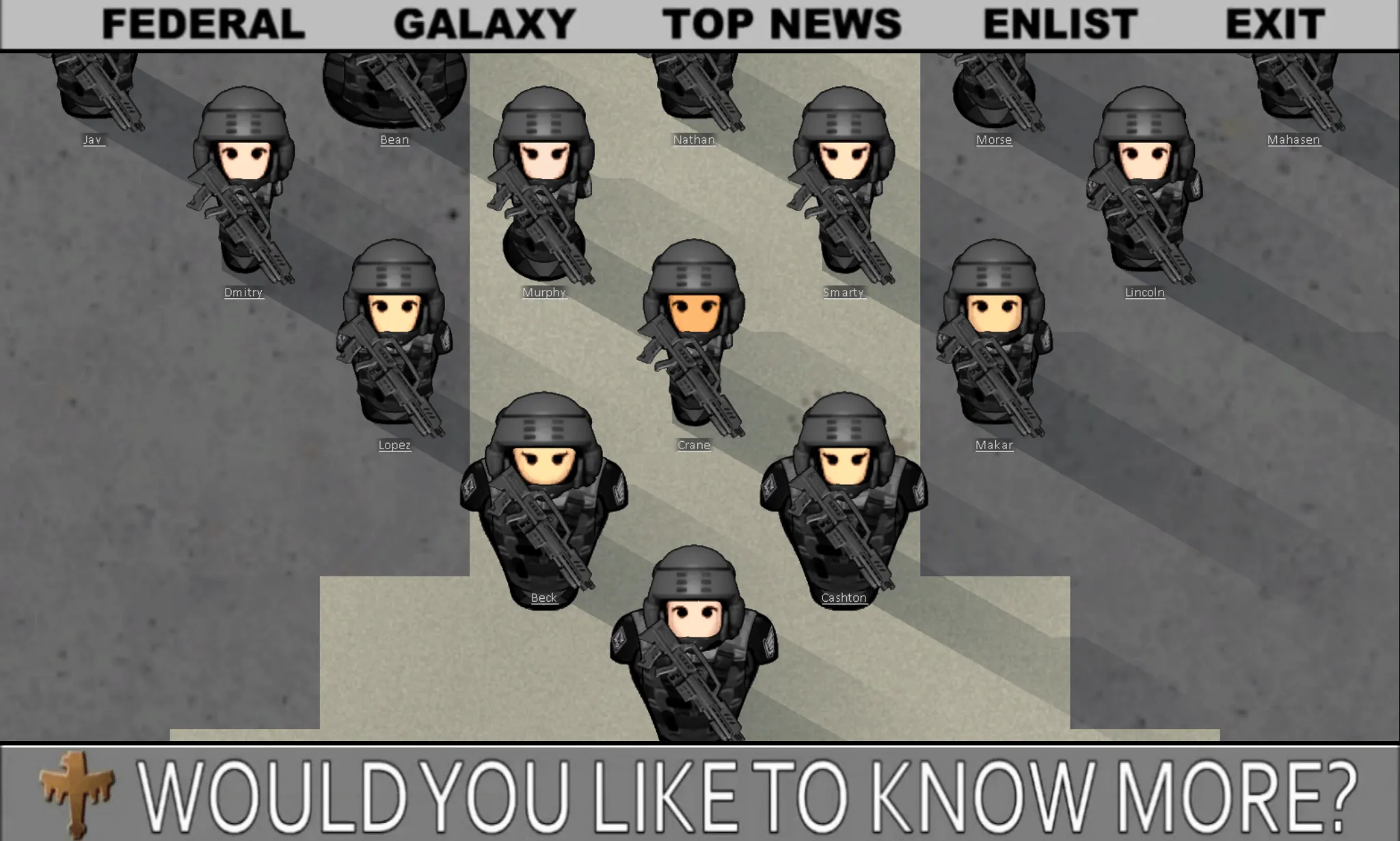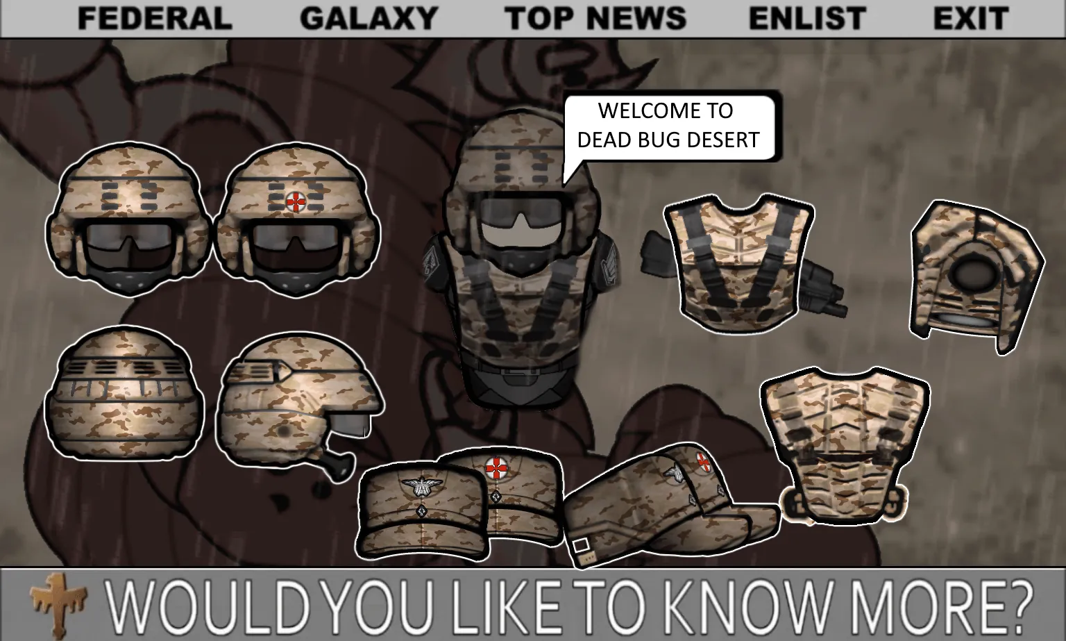 Join the Mobile Infantry today and see if you got what it takes to be a citizen! The rimworlds need peacekeeping and what better way to do it than with the latest weapons the federation has to offer! So grab your guns, load your clips and shoot those bugs! Haven't you heard? There's a war going on! And we need you!