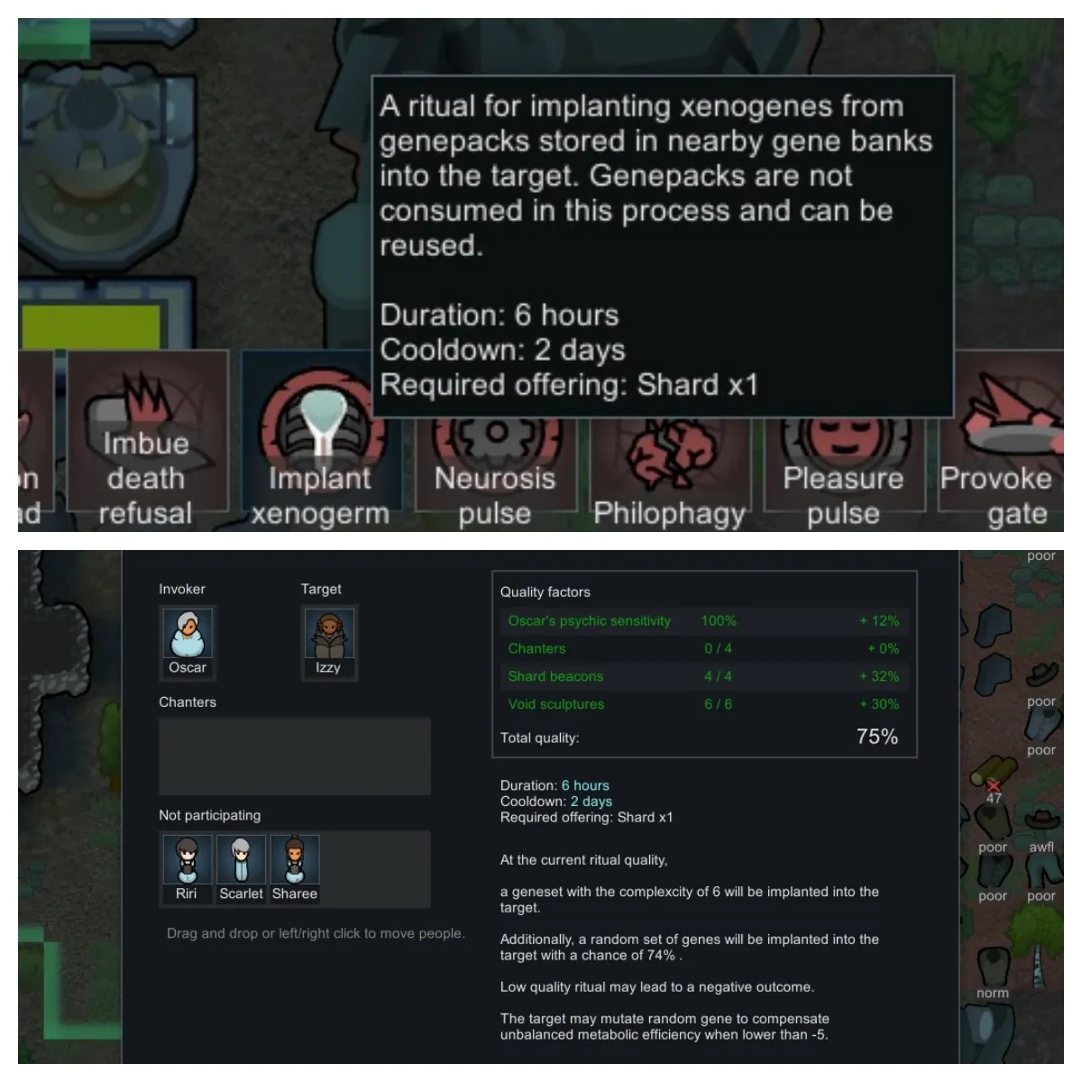 [i]"A ritual for implanting xenogenes from genepacks stored in nearby gene banks (located in the radius of 11 tiles) into the target. Genepacks are not consumed in this process and can be reused."[/i]