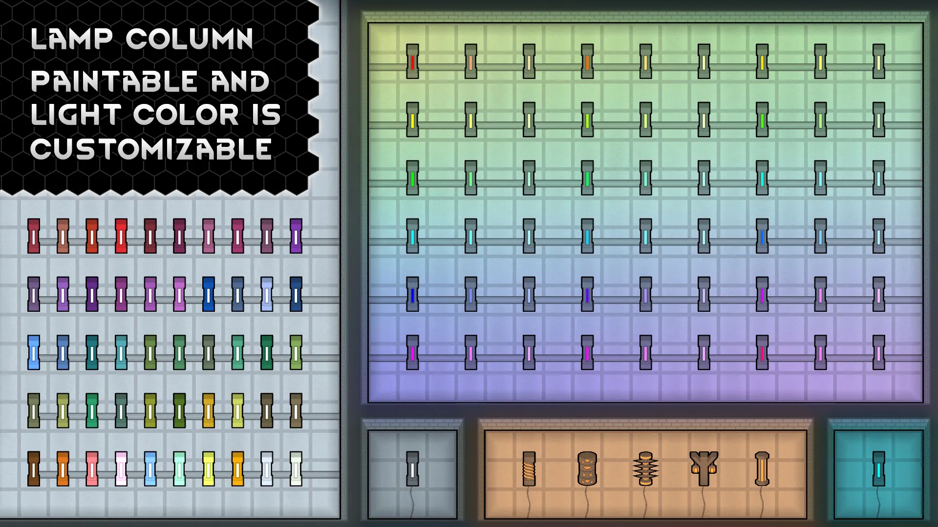 [b]Lamp Column:[/b] for the same cost of a vanilla column and a vanilla lamp, you get both on the same building. Light color can be customized after advanced lights is researched, just like the normal lamp, and they are also paintable, as many other vanilla building now are.