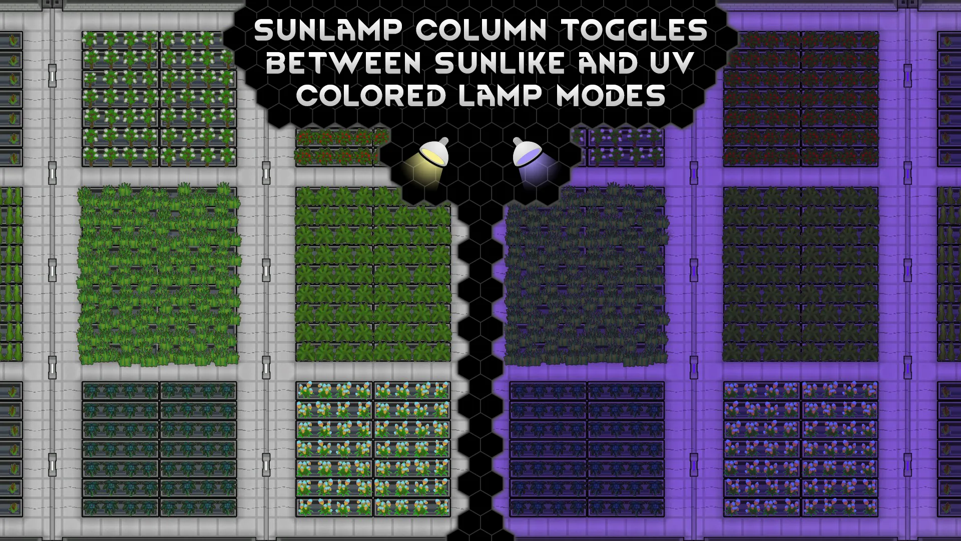 [b]Sunlamp Column:[/b] as with the lamp column, it is built with the same materials as a normal column and sunlamp. Has the same area and power consumption of the vanilla sunlamp, but also has a toggle to change the light color between the vanilla ‘sunlike’ light, and the “Wall Light” mod default UV-purple color of artificial plant growing lights (that I just find interesting). The color toggle is just a cosmetic effect.