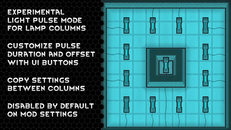[b]Experimental "Light Pulse Mode" for Lamp Columns:[/b] Available for the normal Lamp columns, the "Pulse Mode" makes the colored light visible on the column oscillate between the standard color brightness and a dimmer half-brightness. The duration and offset of the pulse cycle can be customized on the column via UI buttons.