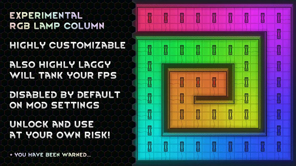 [b]“Experimental” RGB lamp column:[/b] the third column type added by this mod, what started as a testing joke, ended up getting way more time dedicated to it then it should. It has quite a few customization options available on the column itself, settings the color loop cycle order, duration and time offset, and also the game tick update rate, the frequency in which the game updates its surrounding color.