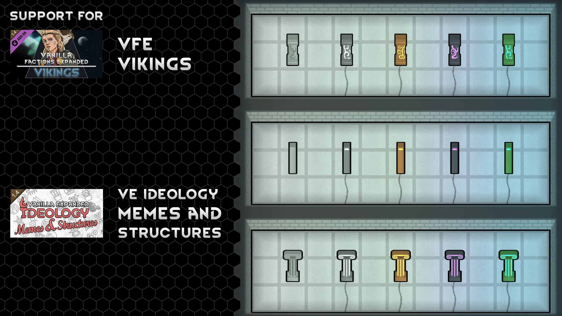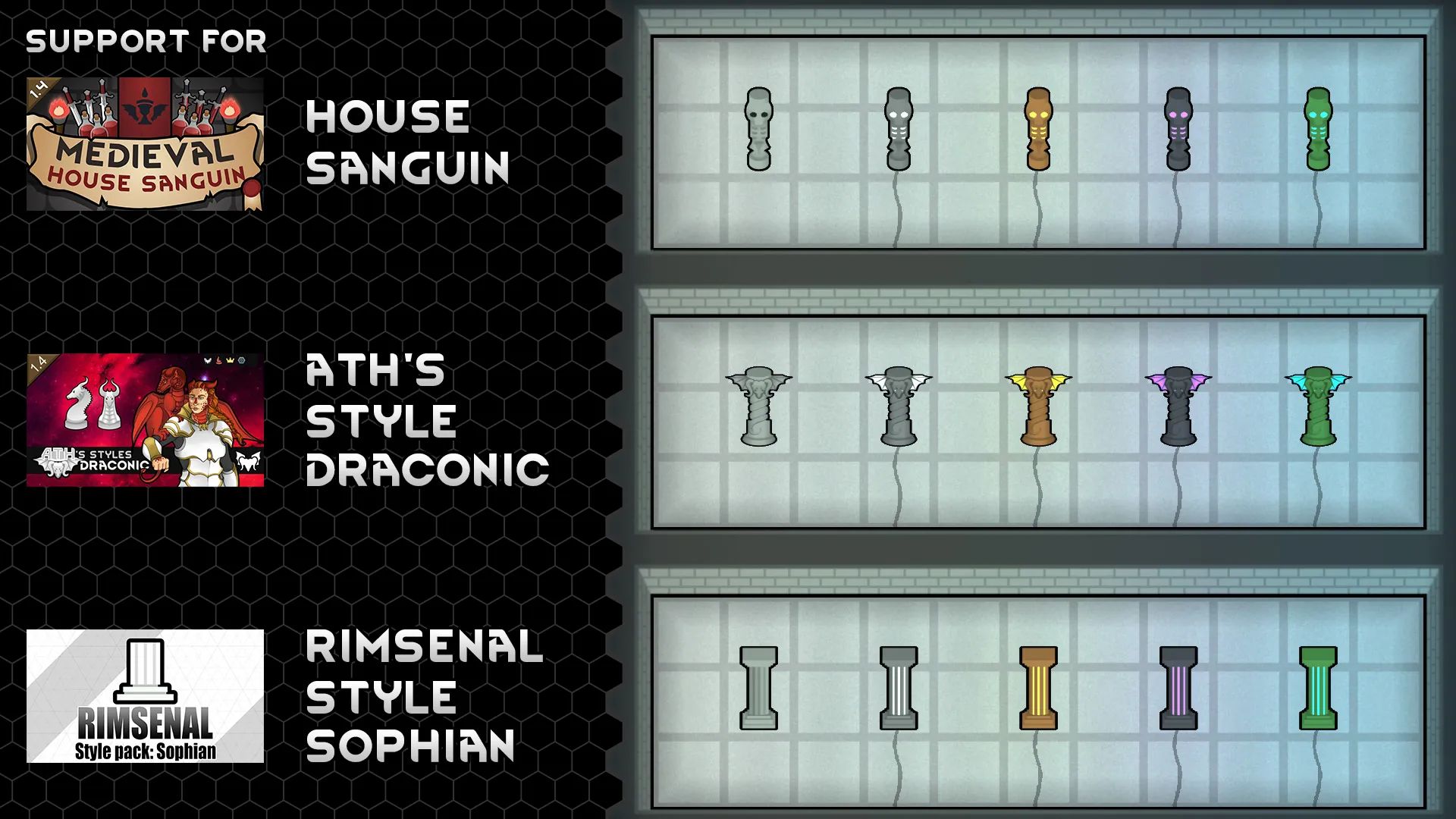To the artists at Ludeon, and the modders from the various supported mods: Vanilla Expanded series, Alpha Memes, ATH's styles various mods, ↁ House Sanguin, Rimsenal Style Pack - Sophian, Gerrymon's Nautian Style, for their original columns textures, that are the bases for the masks and slightly edited textures of their lamp column versions.