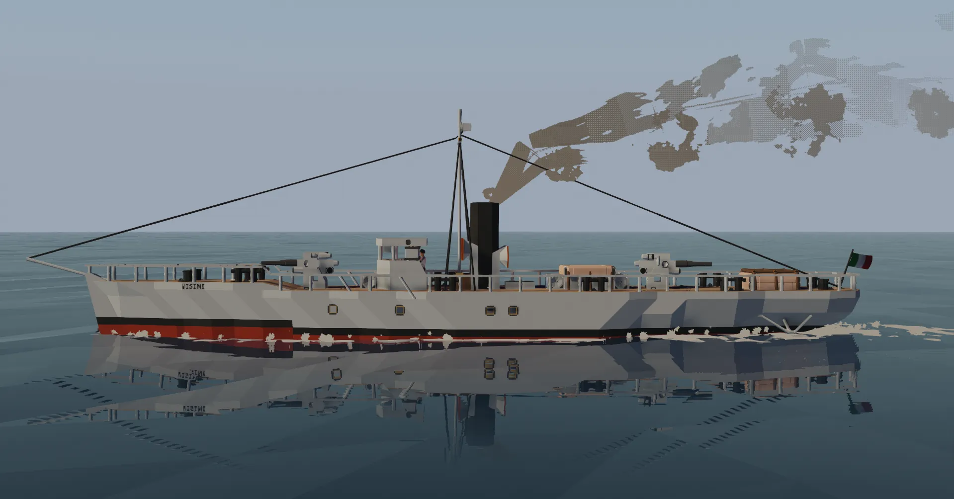 Built in 1899, R.N. Visini was a test platform for the new Parson's Turbine technology and its application in small, fast coastal defense ships. Due to the low capacity of its coal bunkers, it rarely saw extended combat and all ships in the class were decommissioned by 1917 due to the lackluster performance. The knowledge gained from the Visini and its class lead to further development of coastal gunboats. This is a fictional ship with fictional history.