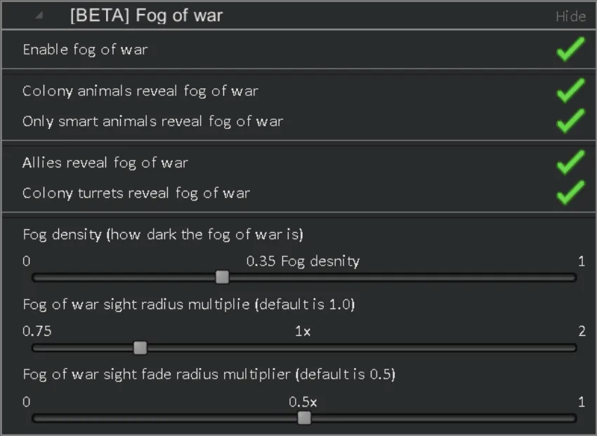 [*] [b]Customizable Fog Of War[/b] You can adjust anything you want, be it how dense is the fog of war, sight radius, etc!