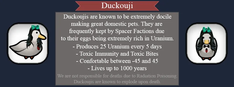 Spacer Faction really love keep Duckoujilings as pets on their Ships due to their size and Uranium-Rich Eggs used as Fuel.