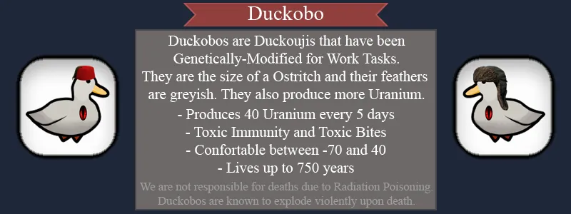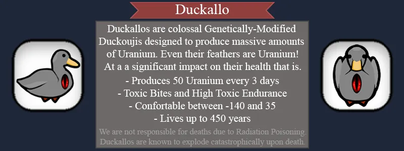 - Adds your local Atomic Duck and some variants to the game: They produce Uranium, are Immune to Toxicity (Except for the Duckallo) and really hate hot climates but can survive extreme colds. Can be bought from Royal/Exotic Traders for a hefty price.