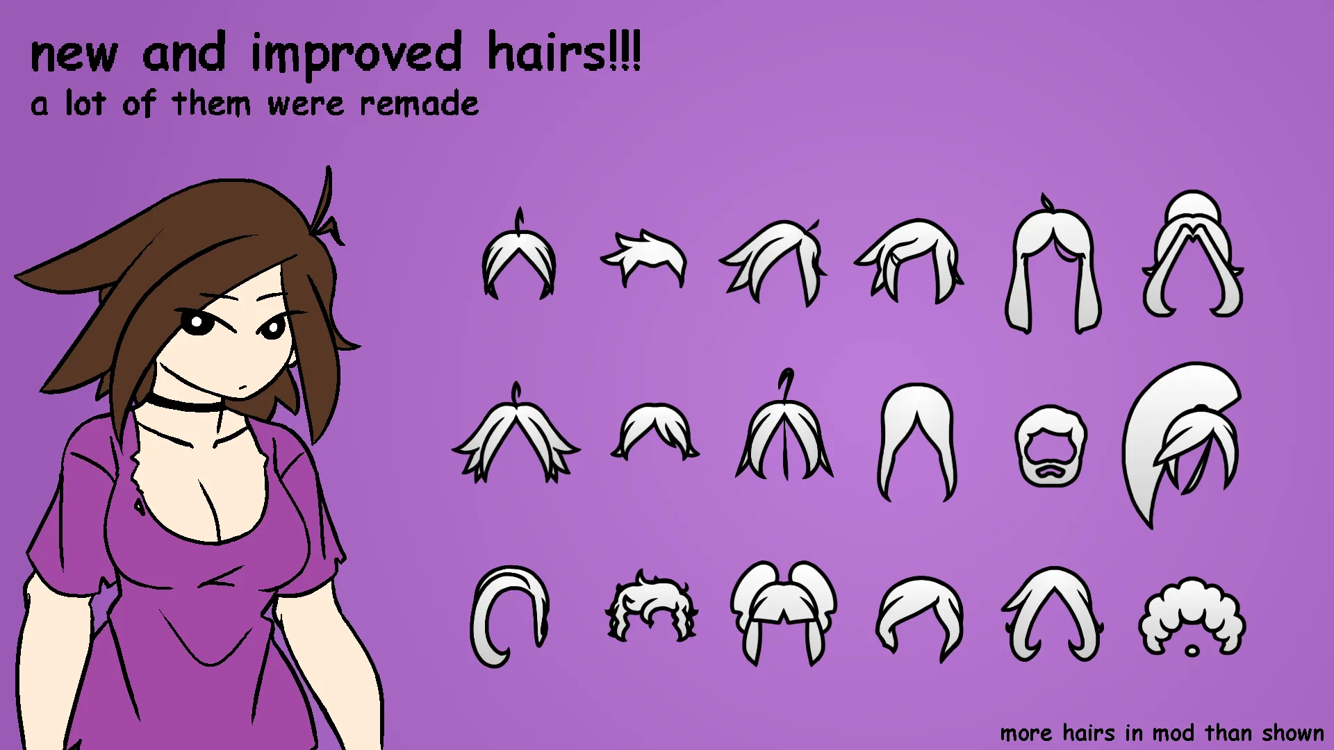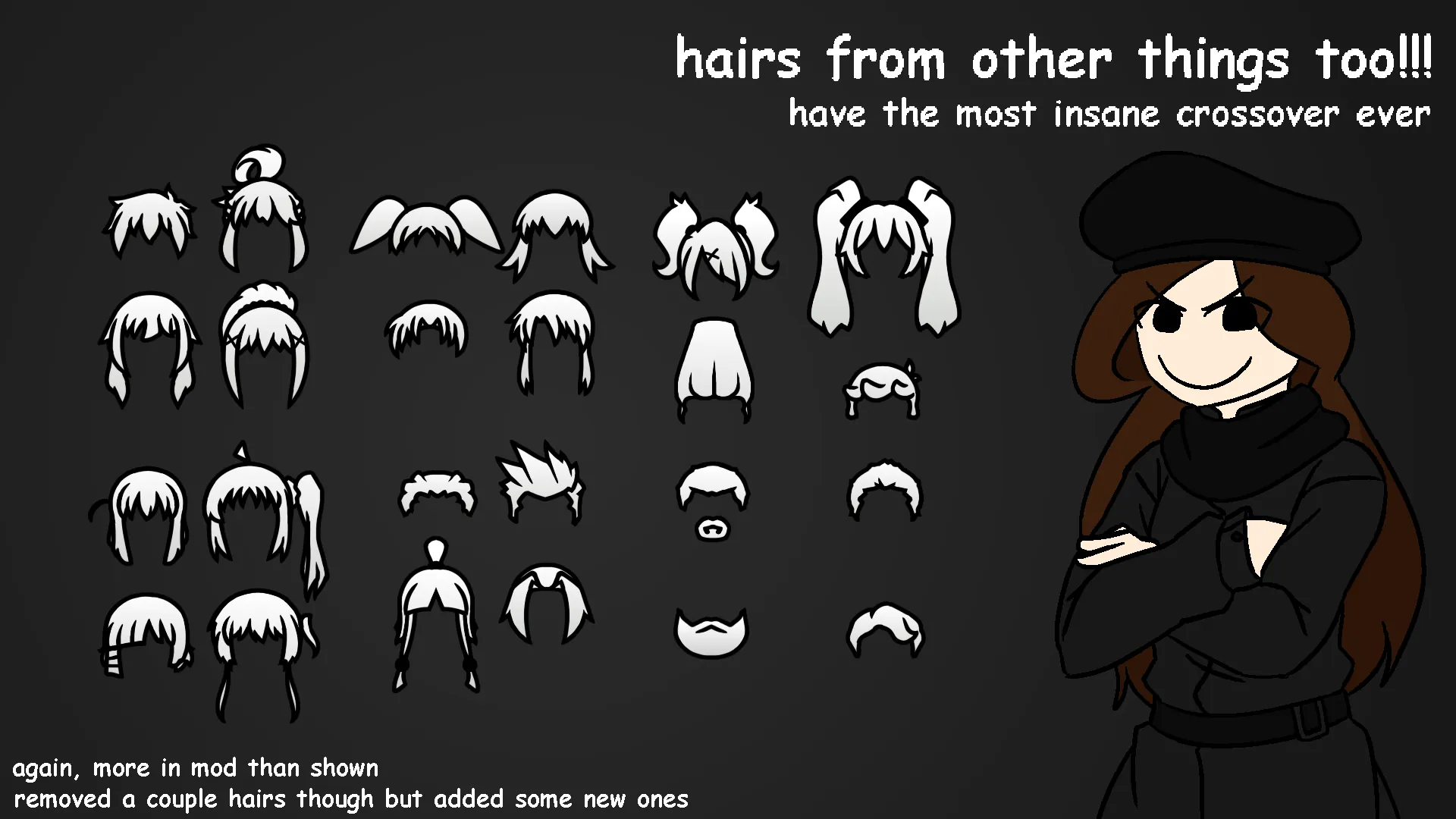 Who the hell makes a sequel for a hair mod? Well, the original hair mod included hairstyles referencing stuff that I either don't wish to associate myself with or personally didn't like. You might've enjoyed the ludicrous hairstyles but I personally changed stances on their inclusion. To prevent any unintended mass baldening, I've opted to instead make a new mod instead of updating the old mod to remove the hairs. Yeah.