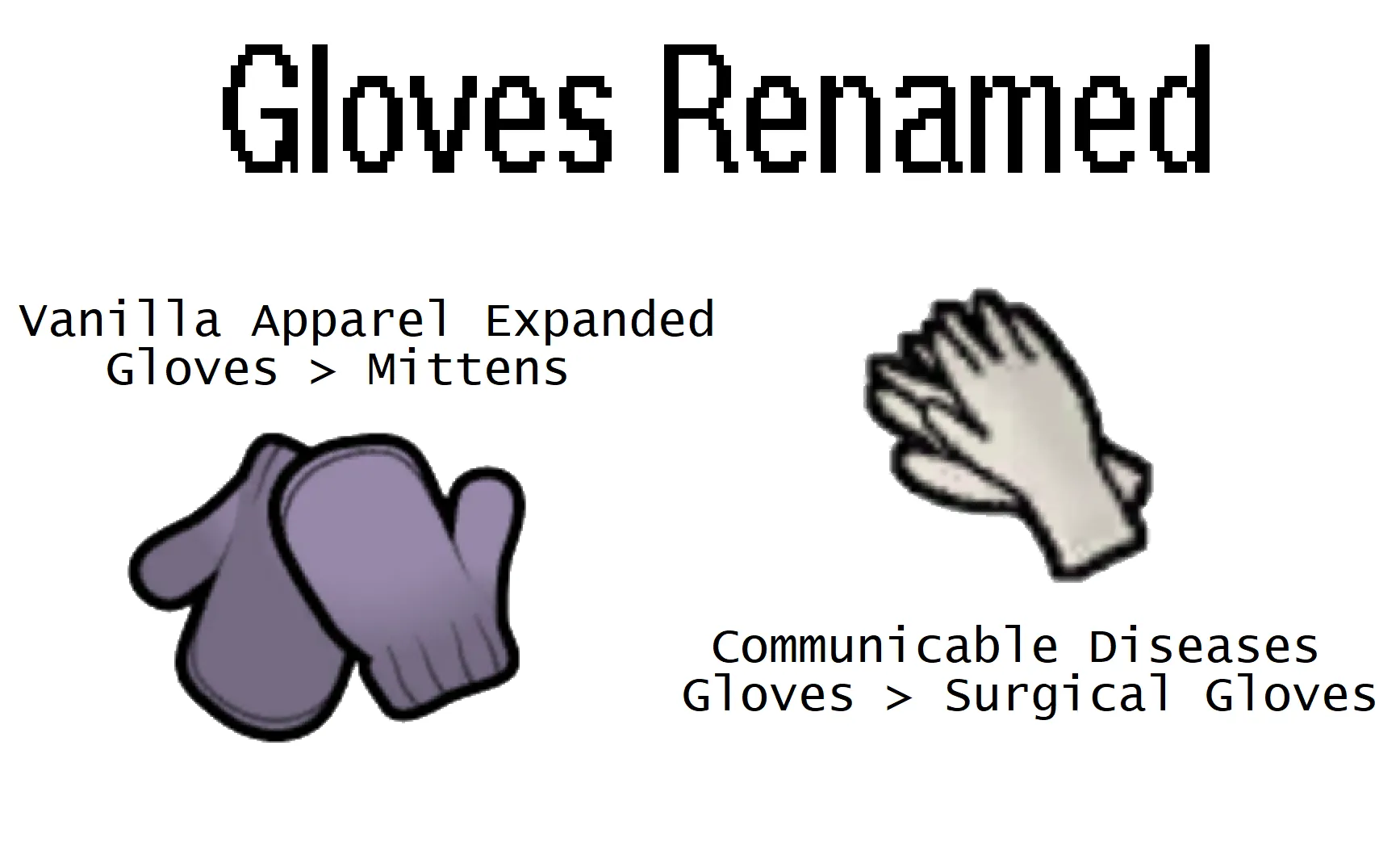 Simply changes "gloves" from Vanilla Apparel Expanded to be called "mittens", and "gloves" from Communicable Diseases to be called "surgical gloves".