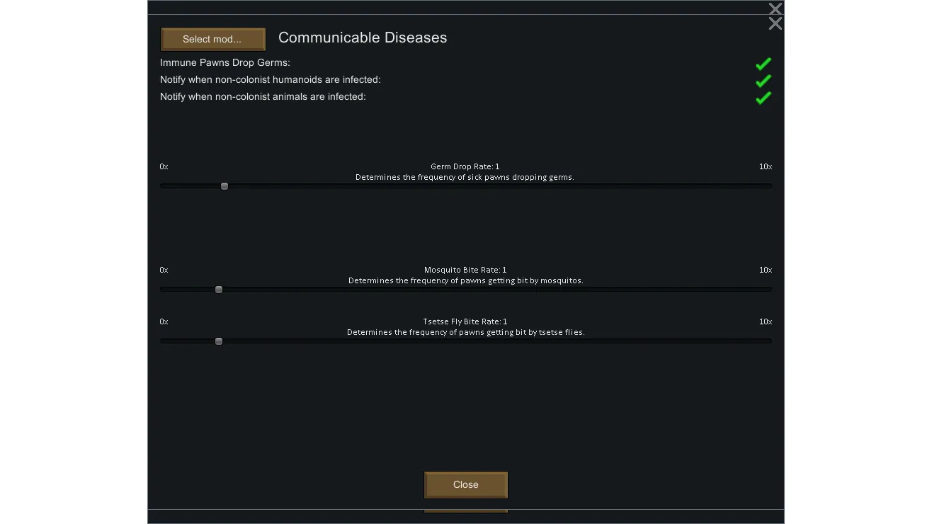 When it comes to disease, the Vanilla experience is very basic: The game triggers an event and a random handful of colonists are infected with the disease of choice. The colonists initially affected by the event are then the only colonists you have to worry about taking care of. With Communicable Diseases, dealing with diseases is no longer so simple. You will now have to worry about certain diseases being transmitted between your colonists. If you aren't careful, your entire colony can become affected by the flu or plague. Animals will also spread animal flu and animal plague.