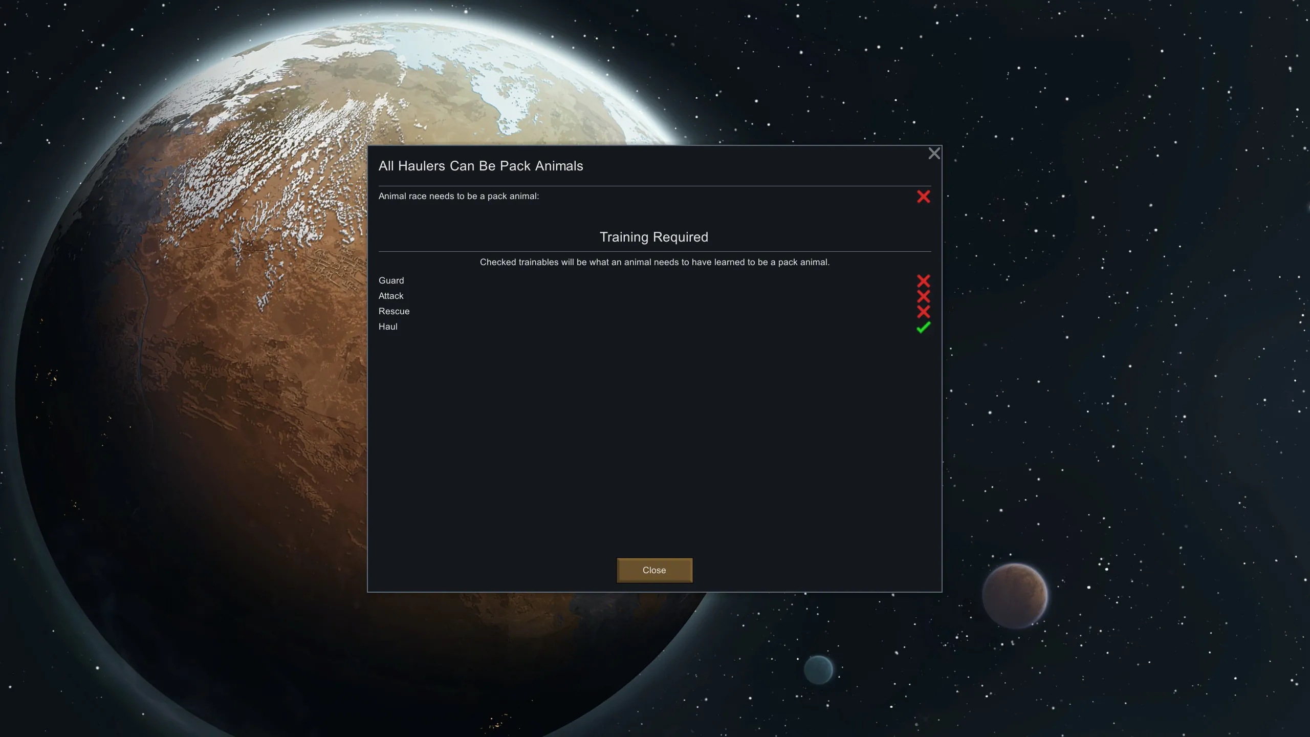 Includes settings to respect (or ignore) the packAnimal property, what an animal needs to learn, and supports modded trainables out of the box.