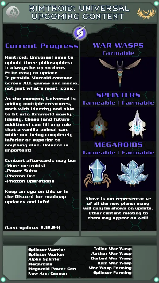 Universal Edition is a chapter of my Rimtroid Series (Such as Evolution, Elder Technologies) that, instead of focusing on a specific area of expertise, introduces a bit of everything, across the entire Metroid Universe. So many different mods and content has been planned for years, but prior to 2024, anything that had it's own category - Phazon, mechanoids, animals, Chozo, etc. - was planned as it's own massive, dedicated mod. Rimtroid: Universal is the solution to that now obsolete idea.