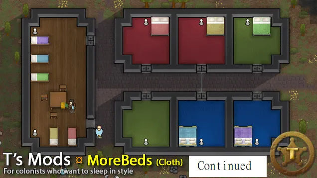 This is a continuation of the "[T] MoreBedsCloth" mod by Telkir. Spruce up your colonists' bedrooms with a selection of different colors for all sizes of beds.