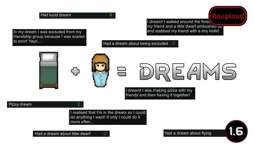 Thanks to this mod, your pawns gain the ability to have nightdreams. Dreams aim to reflect the pawn’s situation and personality as chosen by our framework’s clever algorithm. Stories carried by dreams are hand-crafted by a professional writer.