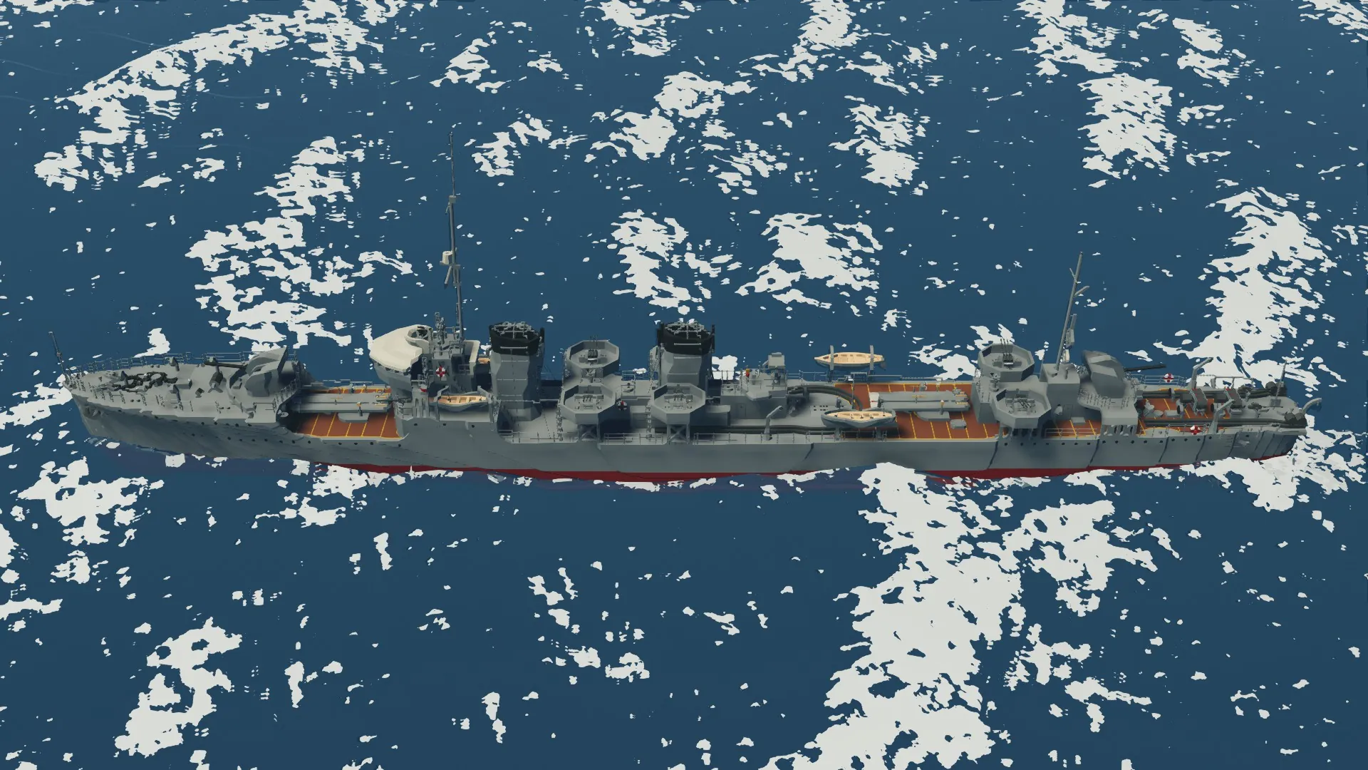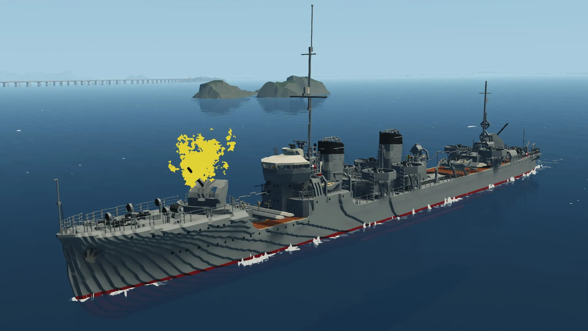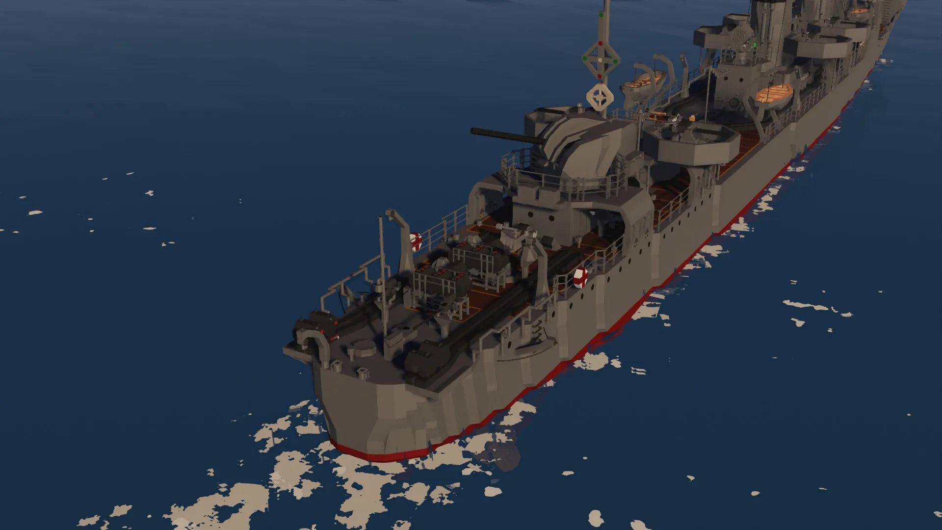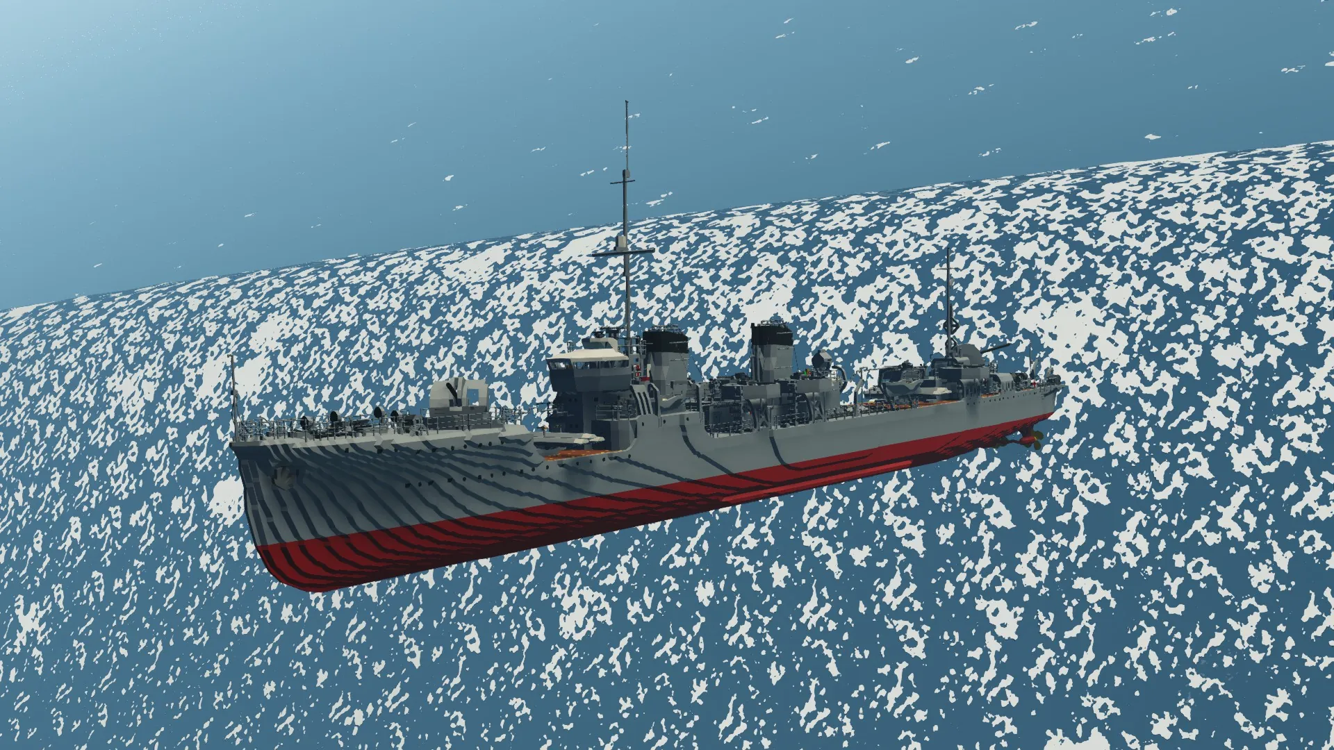 The IJN Mutsuki has been recreated after months of development. For the best experience, I recommend setting your physics to Low. The torpedo launchers and depth charge racks are fully functional. You can control the main guns from the helm, and there are monitors inside the bridge to assist with aiming.