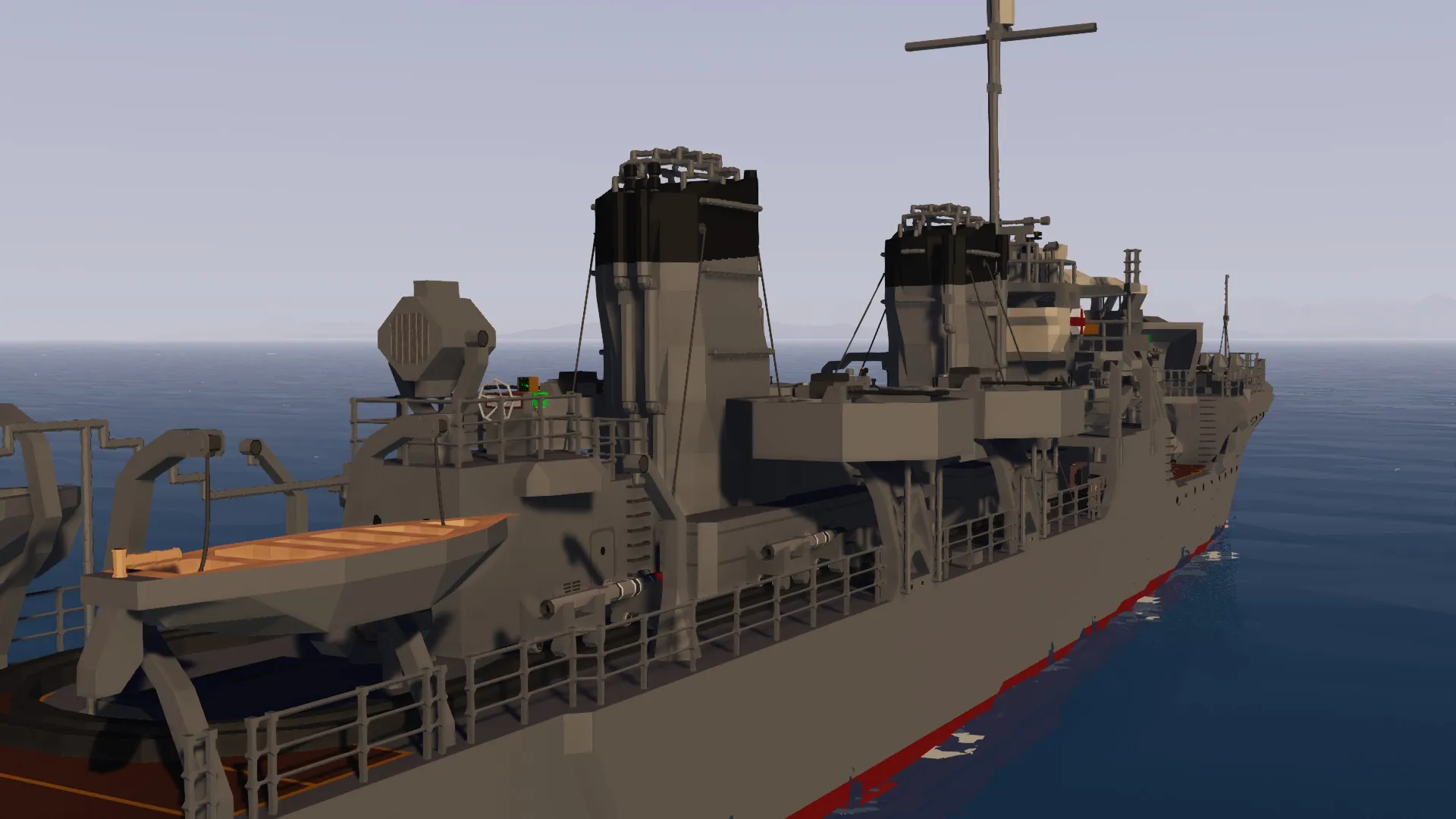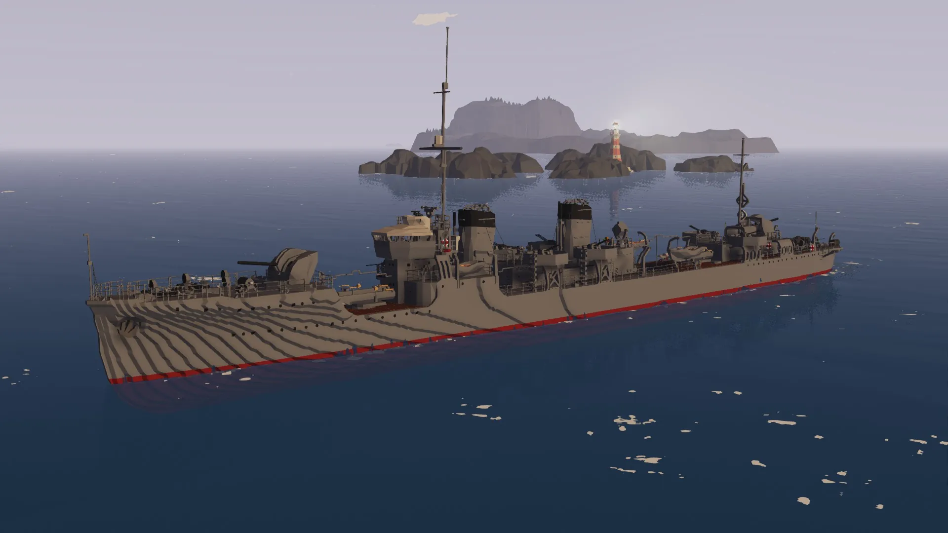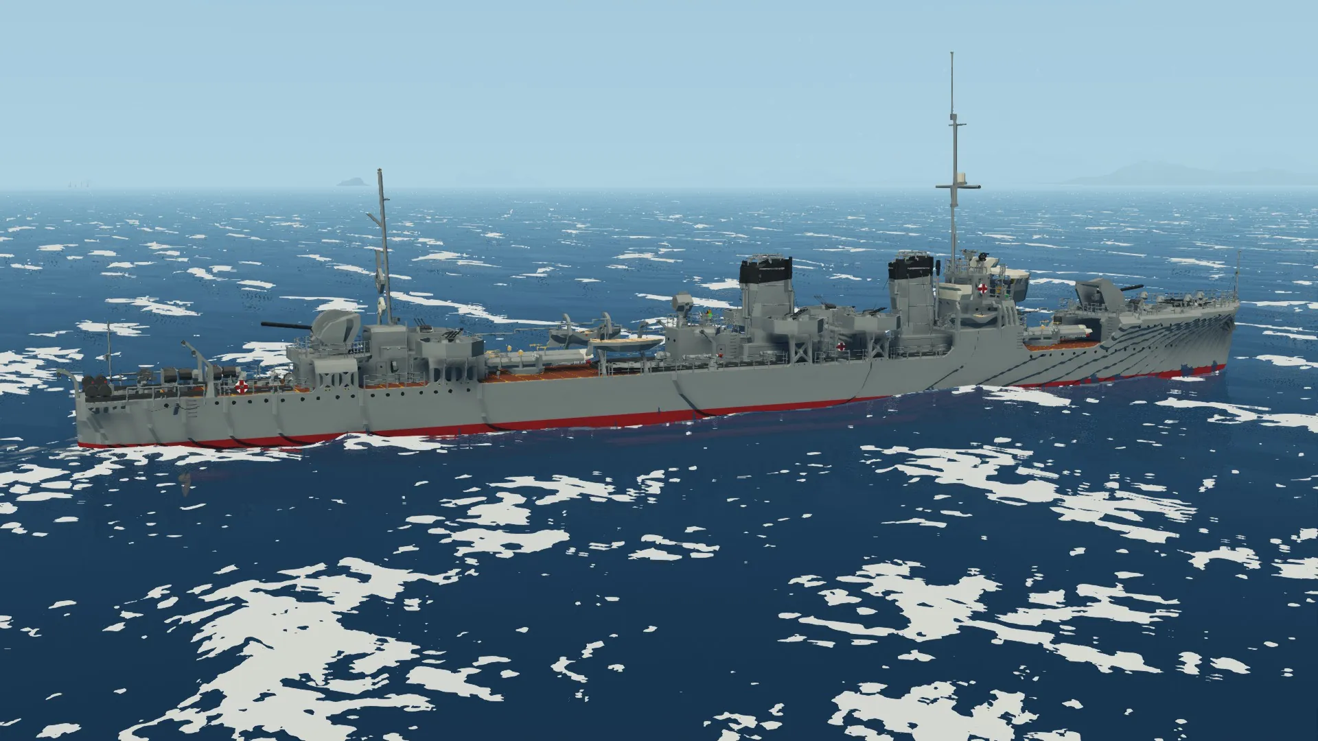 The IJN Mutsuki has been recreated after months of development. For the best experience, I recommend setting your physics to Low. The torpedo launchers and depth charge racks are fully functional. You can control the main guns from the helm, and there are monitors inside the bridge to assist with aiming.