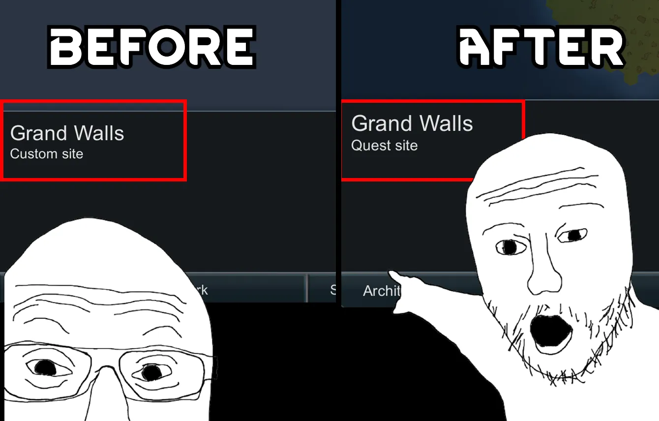 Makes Custom Quest Framework sites blend better into vanilla gameplay by changing their site names and descriptions from "Custom site" to "quest site"