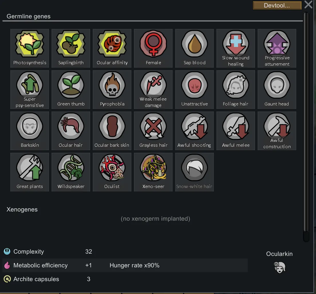 Also, if you have not installed the [url=https://steamcommunity.com/sharedfiles/filedetails/?id=2891845502]Alpha genes[/url], only the phytokin kinds have the oculist gene. if you have installed the mod, only the ocularkin has the gene by default. But you can change this behavior to both phytokin and ocularkin can have in the toggable config of VEF.