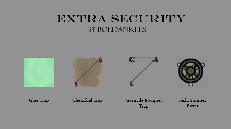 This mod adds 3 new floor traps, as well as a new short-ranged turret to the available security buildings. These new countermeasures allow players to defend their homes in a variety of ways, using materials that aren't typically used by floor traps. Information on these new traps can be found below.