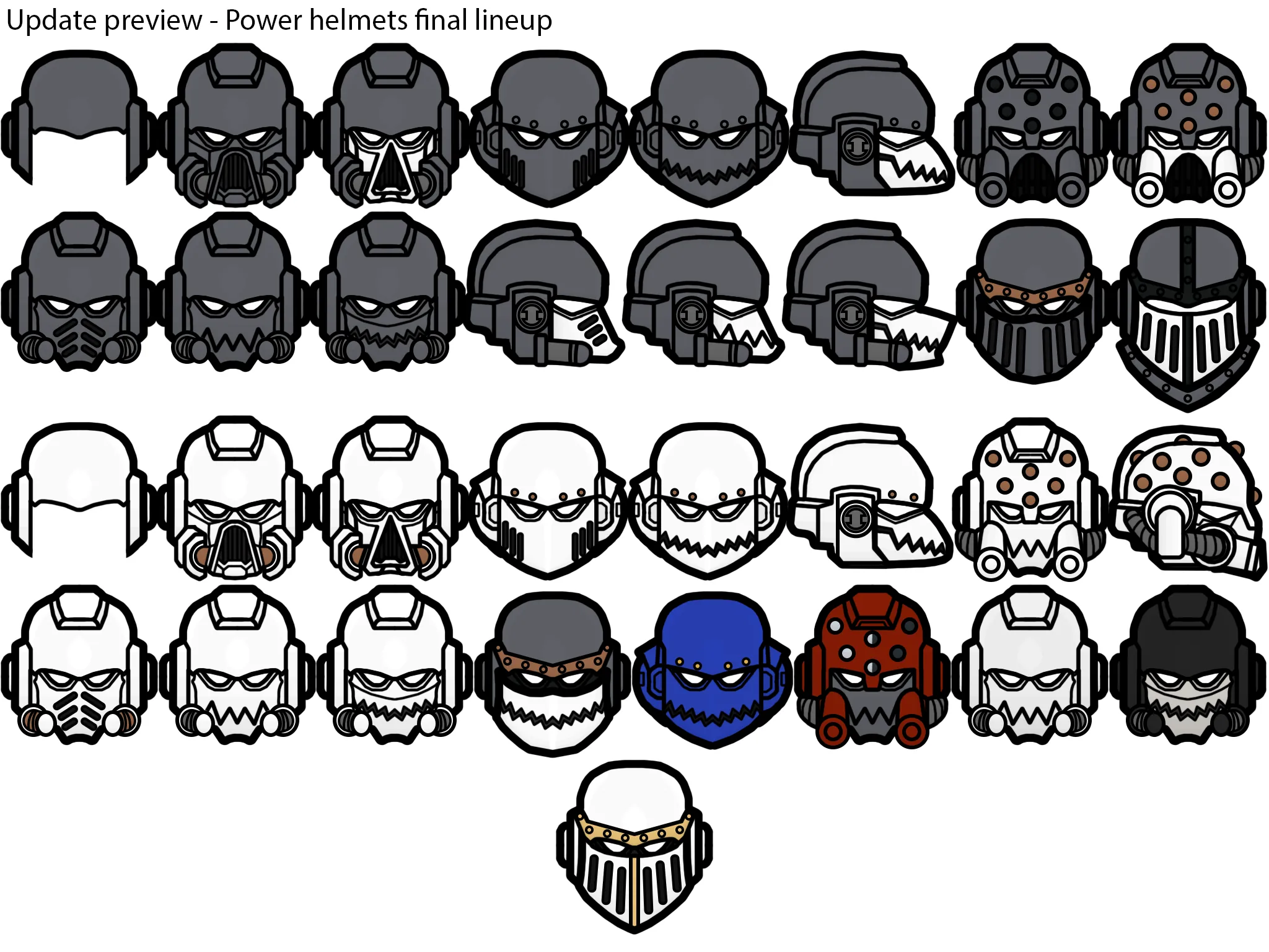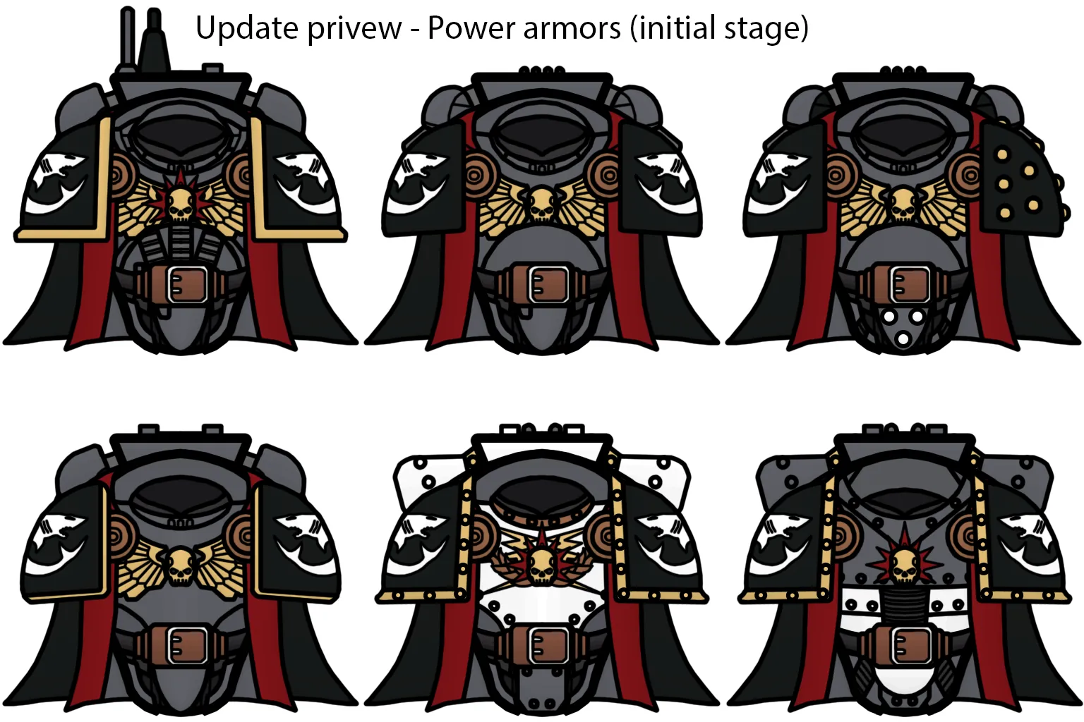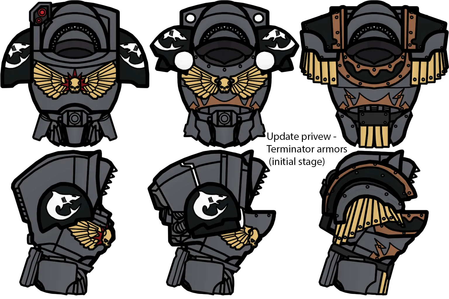[*] Total 9 power and terminator armors with 6 cosmetics, 15 shoulder pads with 16 cosmetics, 36 power and terminator helmets and 17 powerpacks added.