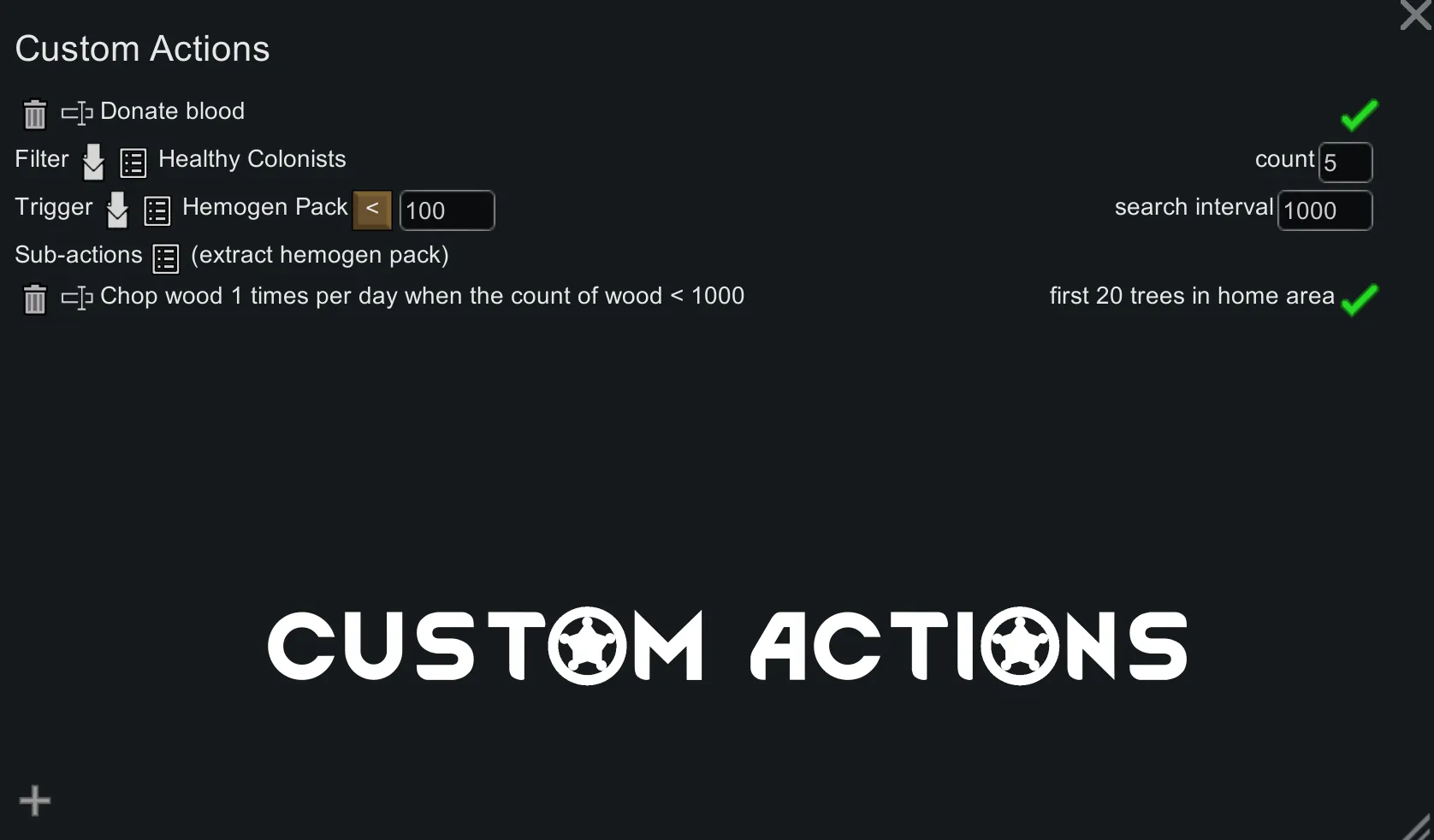 The enabled action will run in a loop. You can set the interval of the loop (for example, blood donation, or harvest harvestable bushes every day). Some options of the action are the same as the ones in [url=https://steamcommunity.com/sharedfiles/filedetails/?id=2895301341]Custom Alerts[/url].