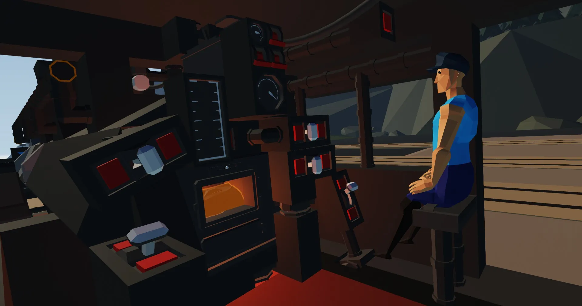 Reverser: Controls the direction in which the locomotive goes. Lever forward = Forwards. Lever backward = Backwards. Due to the way pistons are portrayed in Stormworks, it is impossible to realistically reverse and fine tune the speed of the pistons. The Reverser in this locomotive only operates a gearbox that reverses the direction in which power is applied.