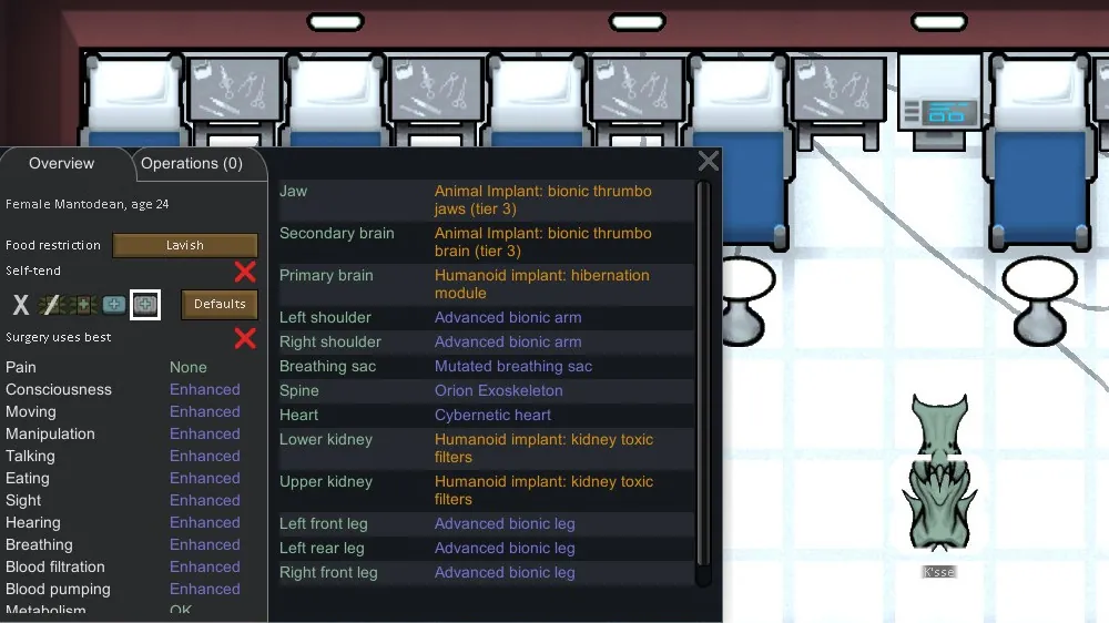 [*] If the surgery is called "Install bionic arm", and your pawn also has a surgery called "Install bionic arm", the body part will be mapped together (like "Arm" → "Tentacle") and your pawn will get other "Arm" operations.