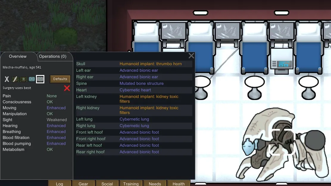 [*] Compatible with most surgery mods, including [url=https://steamcommunity.com/sharedfiles/filedetails/?id=1419675146]FSF's Vanilla Bionics Expansion[/url], [url=https://steamcommunity.com/sharedfiles/filedetails/?id=725956940]EPOE[/url], [url=https://steamcommunity.com/sharedfiles/filedetails/?id=850429707]RBSE[/url], [url=https://steamcommunity.com/sharedfiles/filedetails/?id=1749027802]MSE[/url], [url=https://steamcommunity.com/sharedfiles/filedetails/?id=1548649032]Cyber Fauna[/url], [url=https://steamcommunity.com/sharedfiles/filedetails/?id=746425621]A Dog Said...[/url], etc.