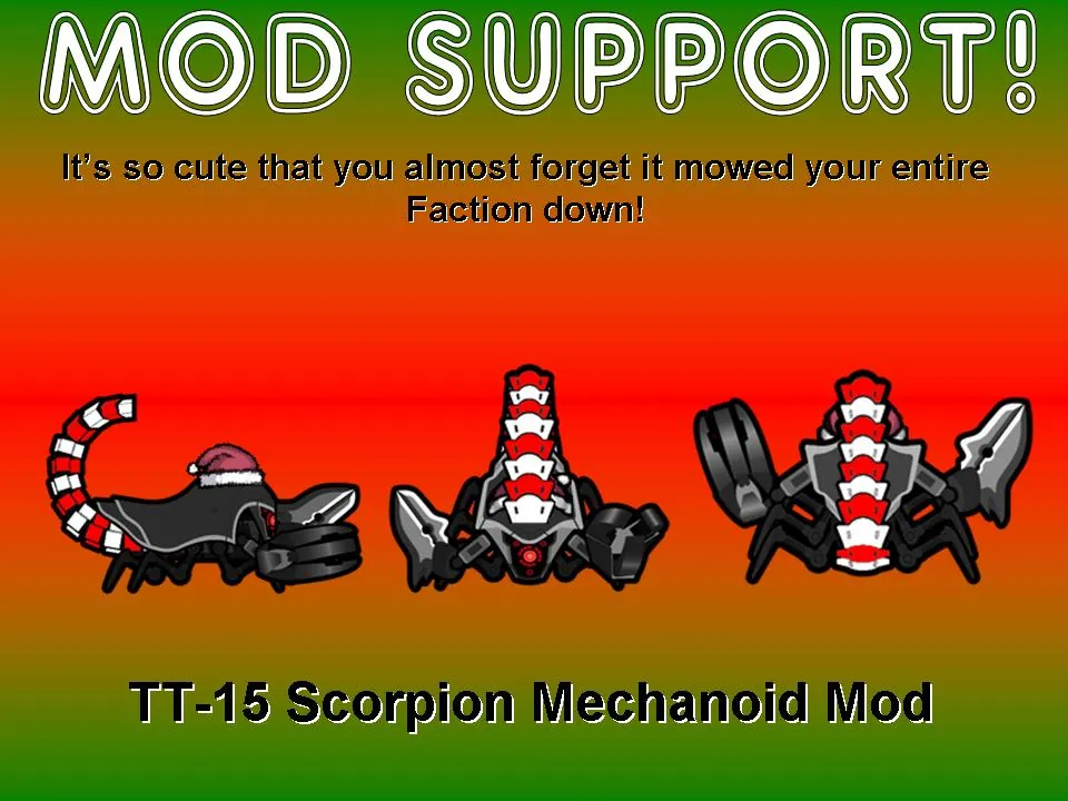 7. Added Textures for the [url=https://www.steamcommunity.com/workshop/filedetails/?id=2966249386]TT-15 Scorpion Mechanoid Mod[/url] ([url=https://steamcommunity.com/sharedfiles/filedetails/?id=3027757370]English translation here[/url])!