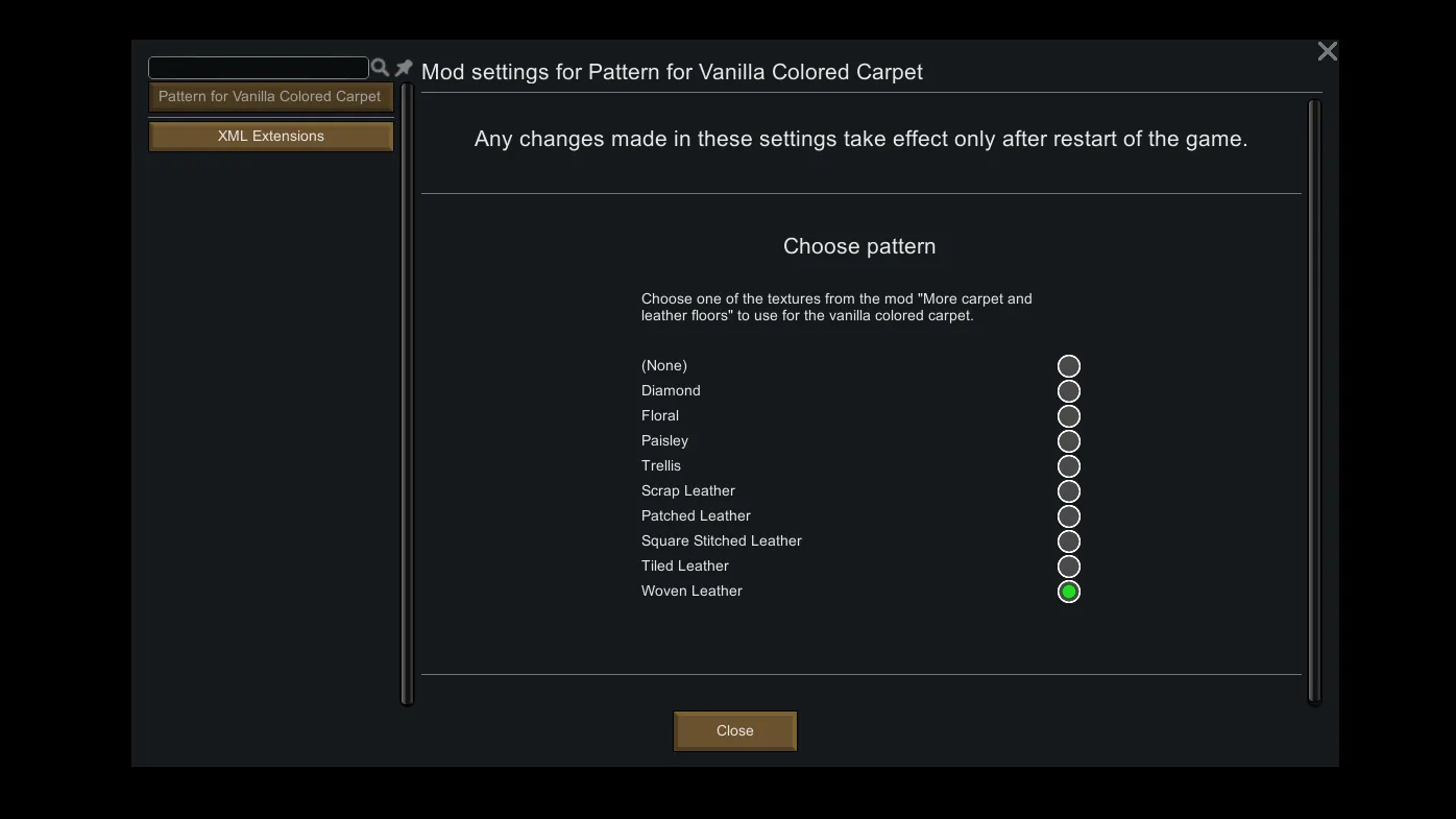 This mod is an add-on for [url=https://steamcommunity.com/sharedfiles/filedetails/?id=1752835169]More carpet and leather floors[/url]. It allows you to give the vanilla colored carpet a pattern which you can choose from the textures of carpets and leather floors.