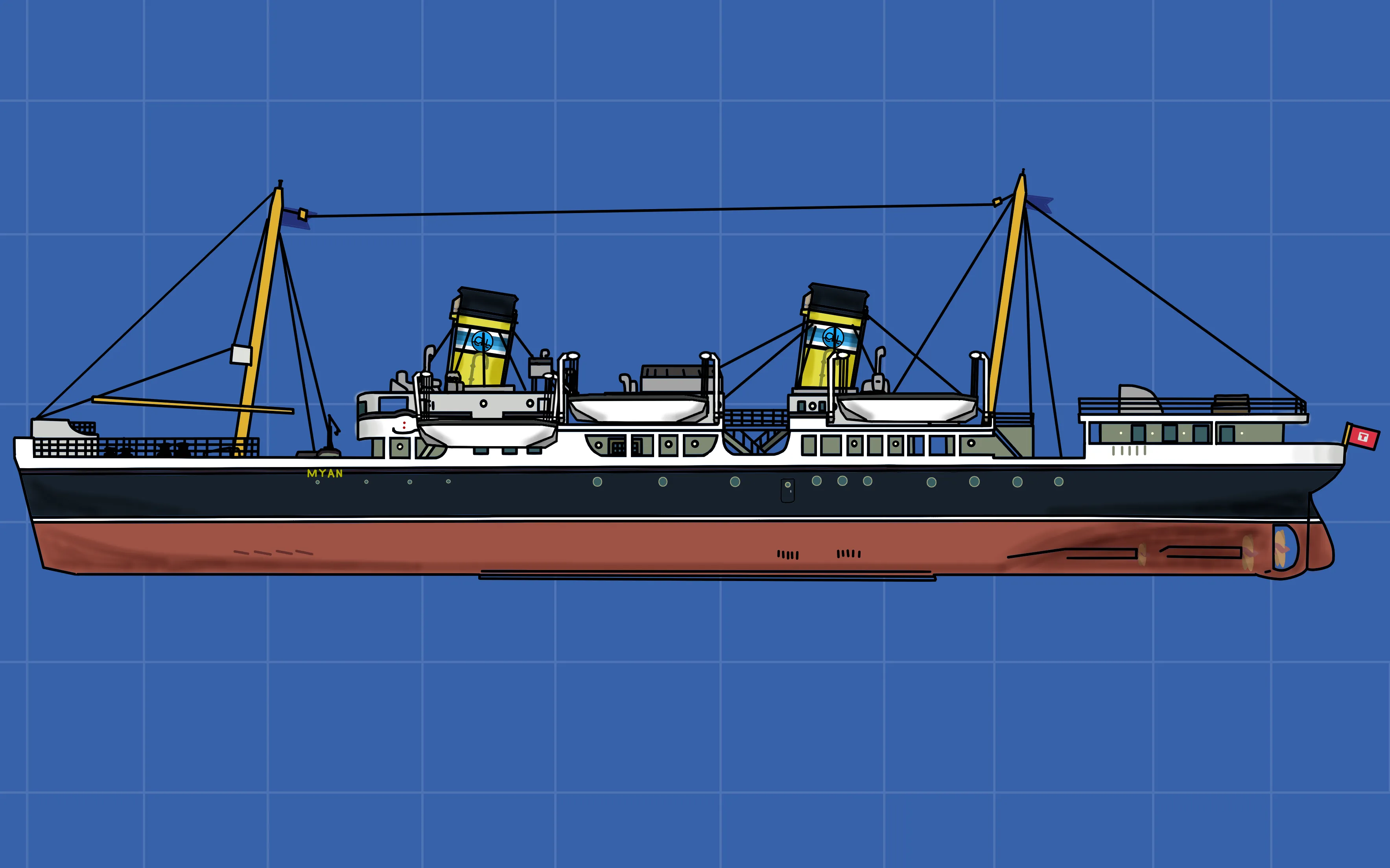 so she runs purely off of Electric engines, which at the time were like the only functional engines in game. the only purpose the boilers serve in the MYAN, is to pump out coal smoke giving off the illusion that she is both Steam, and Electric. Due to the fact that she has electric engines, infinite electric needs to be on at all times in order for her to work properly. The life boats, the chess board, and the steam generator (which has no functional purpose anymore other than to be weight keeping the MYAN from floating too high above the water line) are not my designs, the rest of the ship however is custom made.