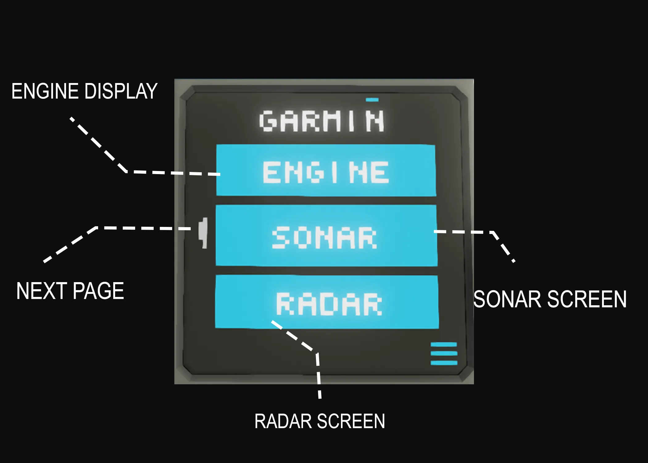 [url=https://steamcommunity.com/sharedfiles/filedetails/?id=2868633133&searchtext=marine+radar][b]Radar[/b][/url] - [b]Credit[/b] SeaWeed - This is a 2x3 radar, but only the radar portion is required, and only the radar portion is seen on our GARMIN display.