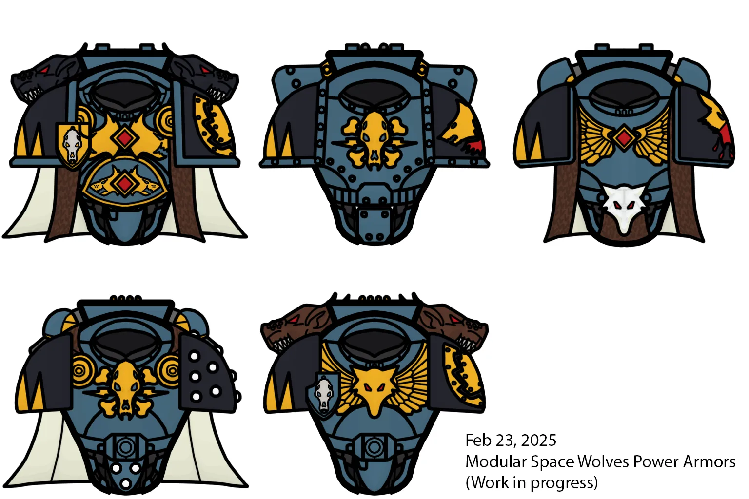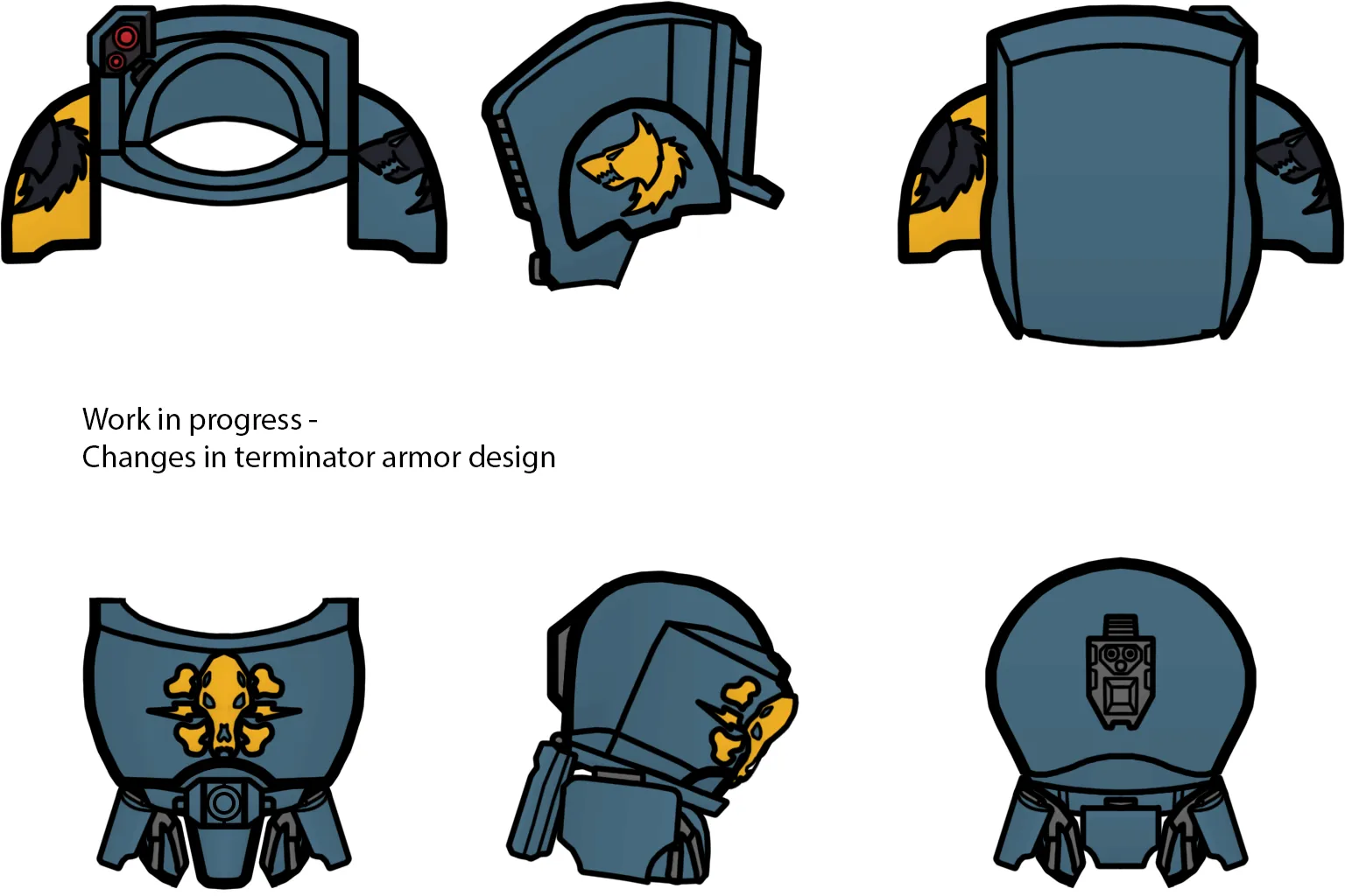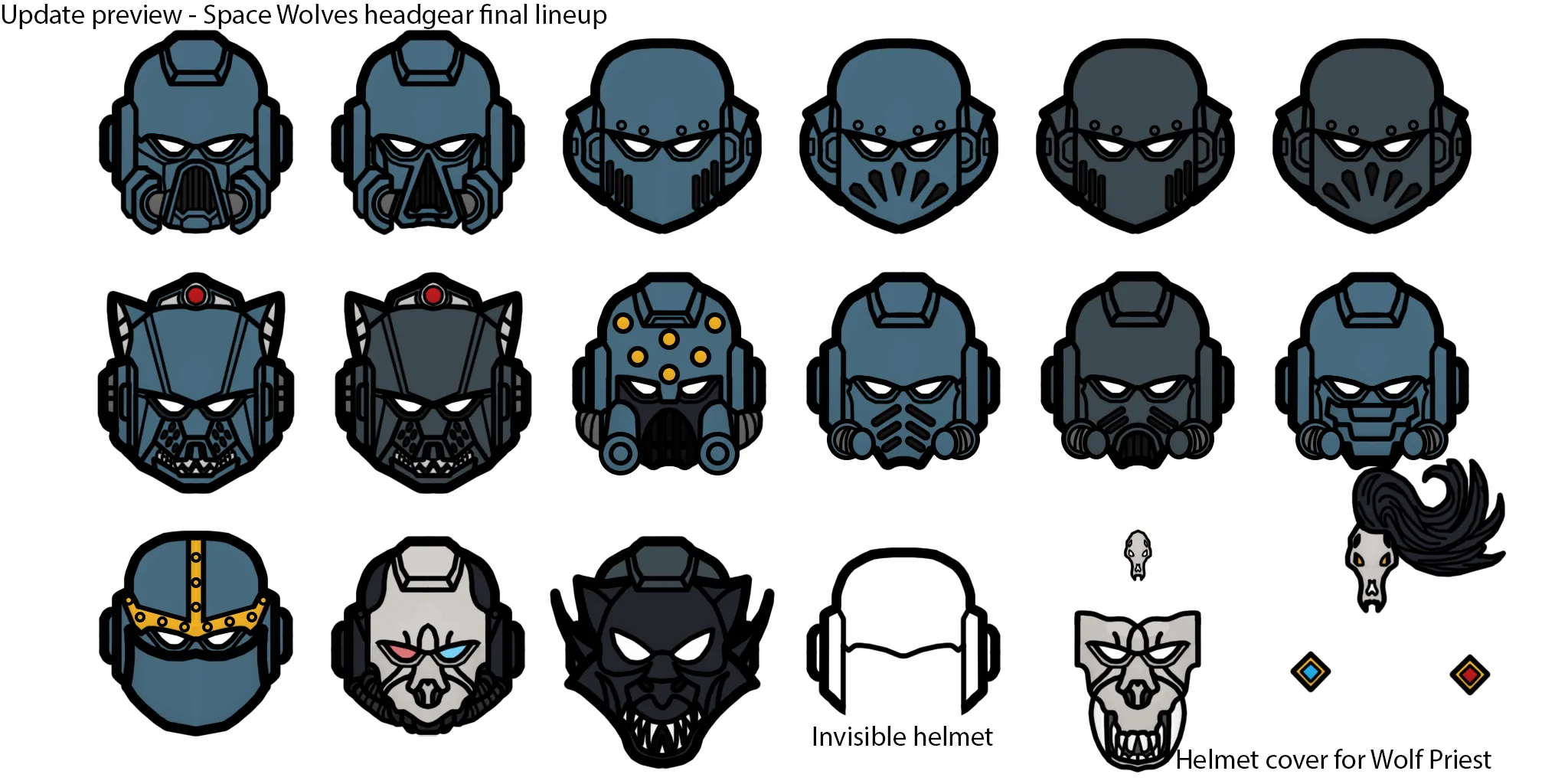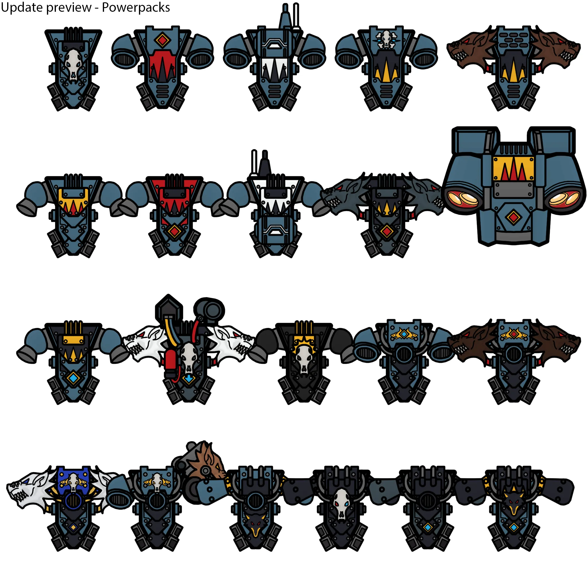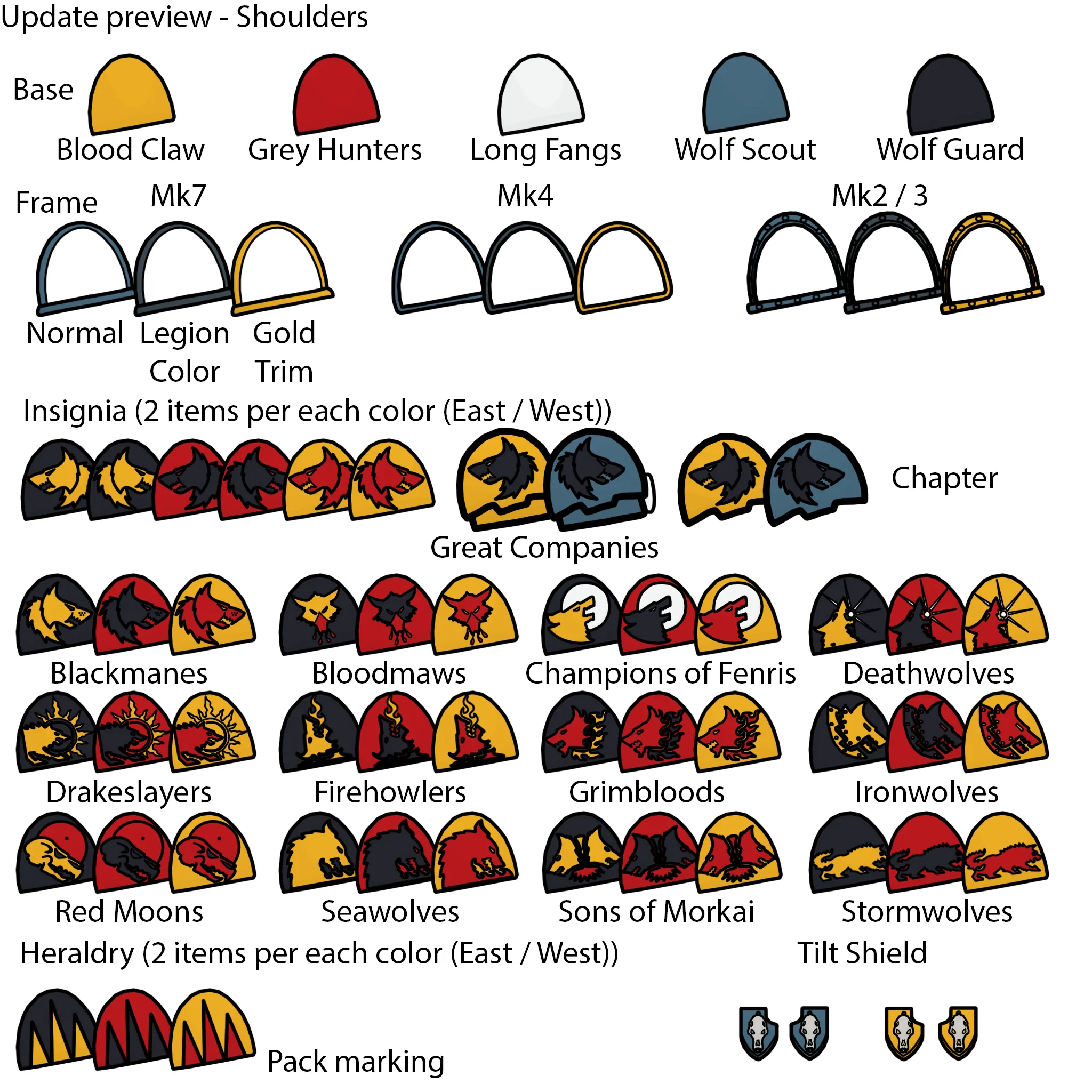 [*] Total 17 Space Wolves power and terminator armors with 25 cosmetics, 20 power and terminator helmets with 5 cosmetics, 20 shoulder pads with 96 cosmetics and 26 powerpacks added.