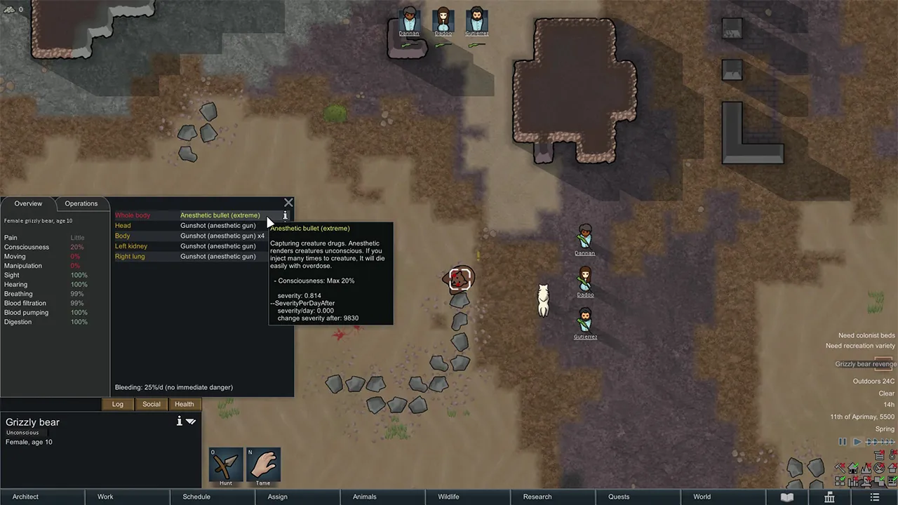 this MOD add the anesthetic gun(tranquilizer gun) to your RimWorld. the added gun is very low power, but its bullets decrease the athletic ability and consciousness to the hit opponent. you can stun the target by hitting the bullet many times. so you can neutralize the target with less damage with this gun. basically, the heavier the weight, the more bullets are needed to neutralize it.