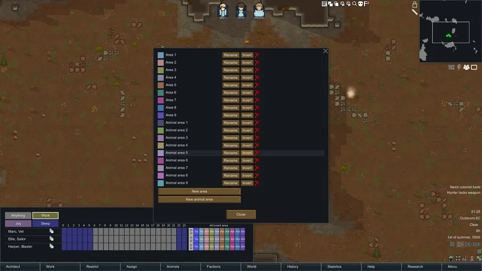 While this completely removes the limit on the number of areas you can create, the area selection widget in other parts of the UI is untouched - and designed for 5 areas per type. If you create too many areas, you may run into issues. This practical limit depends largely on your resolution and UI size factor. I have no plans to update these UI issues, nor could I do so for all the mods that use areas.