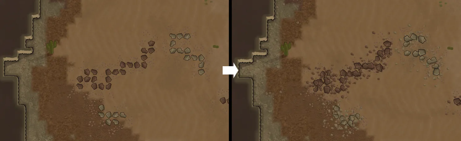 [*] [b]Rocky debris:[/b] To complete the look, a unique class of filth has been added: rocky debris. This filth spawns underneath both stone chunks and cliffs. Unlike normal filth, which will despawn after some time, rocky debris won't ever despawn so long as it shares a tile with a chunk/cliff.