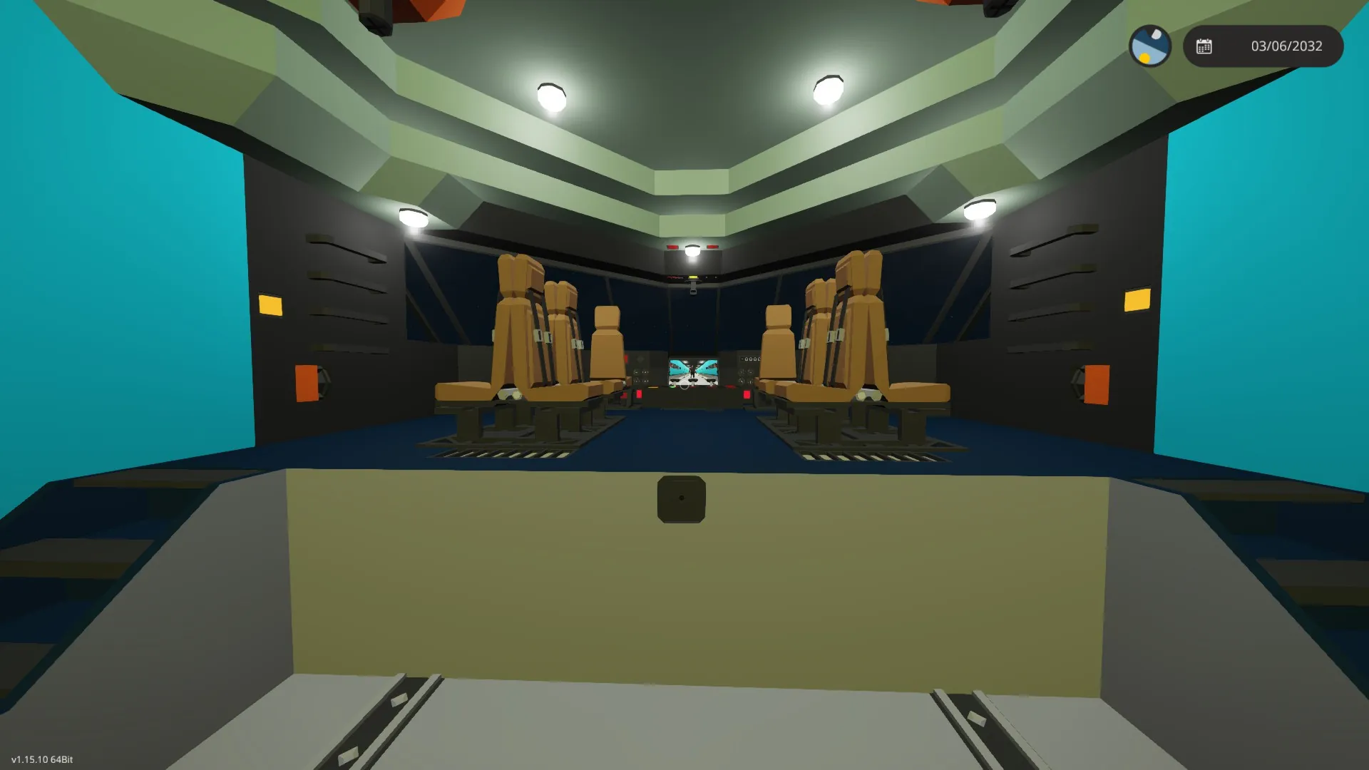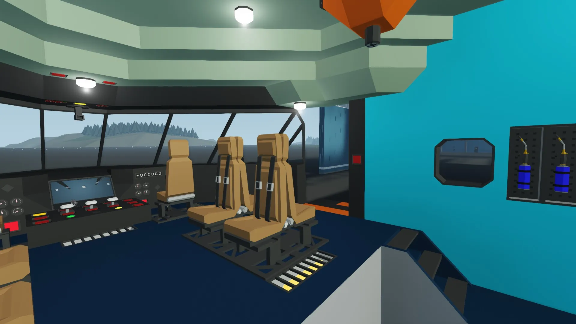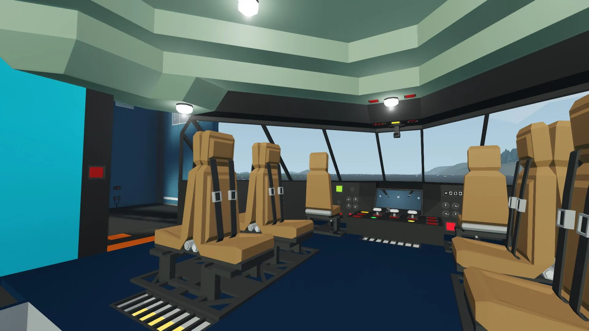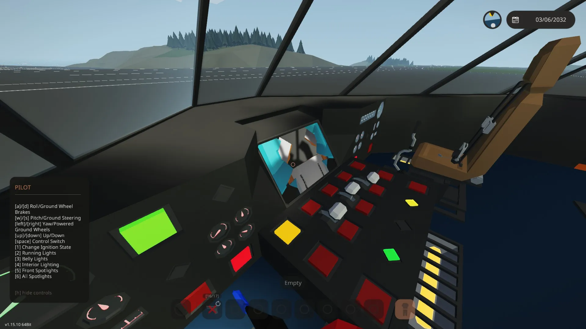 The dashboard in the cockpit contains many buttons, and many more dials/gauges. There is a panel that displays the outputs for the airborn controls (Pitch/Roll/Yaw/Collective) along with an indicator on the pilot's side for Copilot having control, or for the Copilot requesting control. Above eye level is the controls for the belly winches, the keypad for the automatic heaters, cabin lights toggle, and a force heaters on toggle. In the center, there are three levers: Closest to the pilot is the engine throttle, in the middle is the rotor clutch and closest to the copilot is the thrust spoiler for the jet engines. Also in the middle is a 2x3 Monitor that displays a rear view, cargo bay view or belly view, through the use of two two-step toggles and five small cameras. The final dial cluster contains fuel fill level (in %), fuel pressure (Atm), airspeed (in km/h) and vertical speed (in m/s). There is an Altimeter, and pre-labeled inputs in the pilot/copilot's seat labeled for different lights
