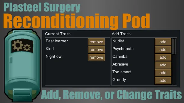 Introducing the Plasteel Surgery Reconditioning Pod. Just one relaxing day(s) long session in this modified crytosleep casket will leave colonists feeling like a whole new person! Unwanted traits can be removed, or better traits can be added. Want someone to have the opposite trait they do now? Well no problem, traits in the same spectrum can be swapped out for one another, so trade that slothful nature for a more industrious attitude. Upon first use the pod will be biometrically encoded to the user, ensuring they always have a pod just for them.