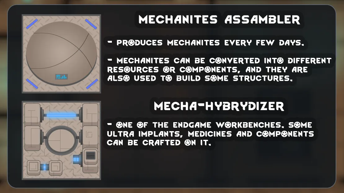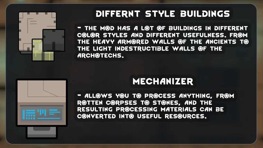 Mod "WVC - Ultra Expansion" aims to expand the endgame by adding a bunch of new bionics (can be enabled or disabled in the settings), several types of walls, doors, floors, some tables and stools, as well as several new resources, workbenches and others little things.