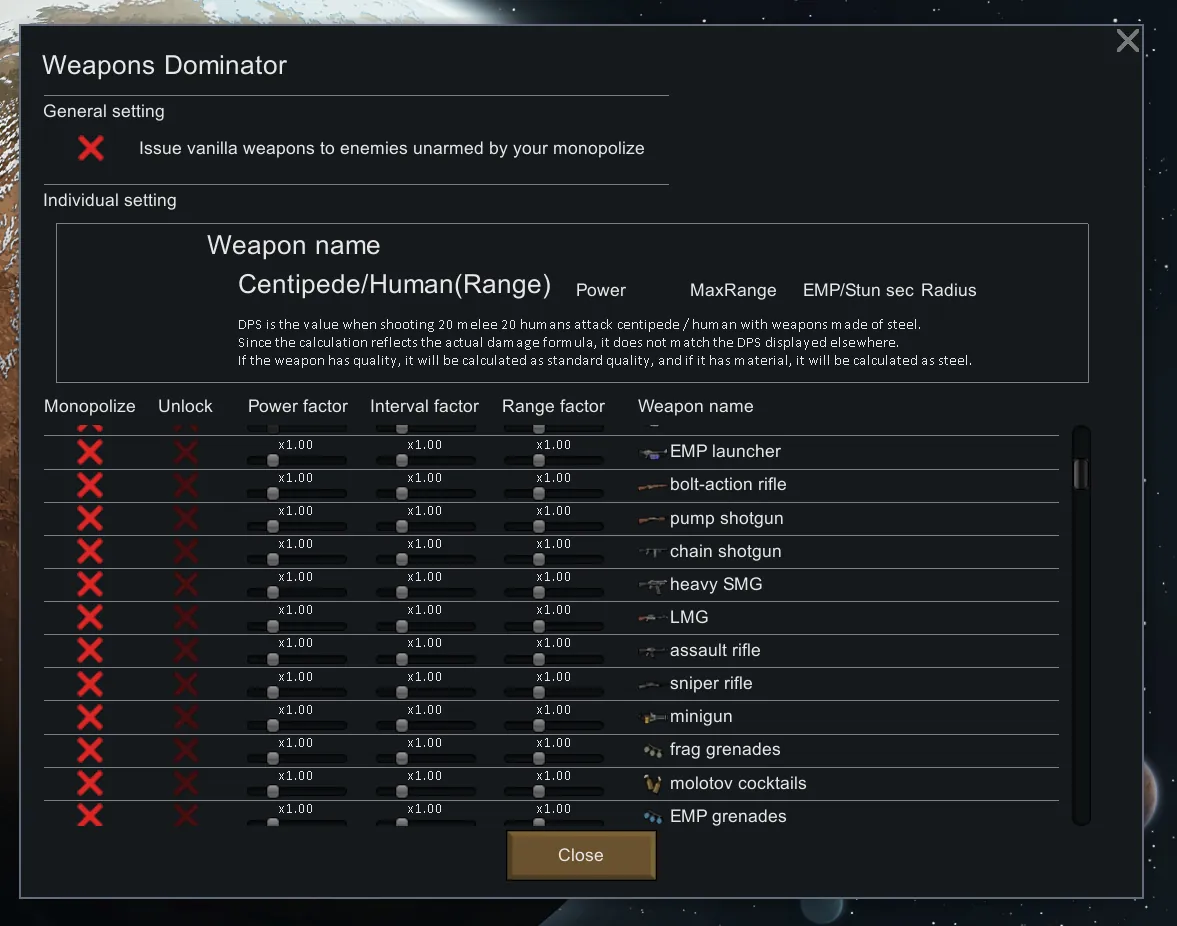 [b]Warning:[/b] Maximizing the Power factor and Interval factor turns even crude weapons into the ultimate killing weapons.