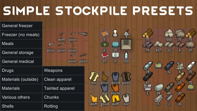 A mod that adds various presets for stockpile settings in a comfortable float menu. You can use them to easily set often used storage configurations, both generic ones (like freezer stuff) and specific ones (like food, drugs, weapons or clean apparel).