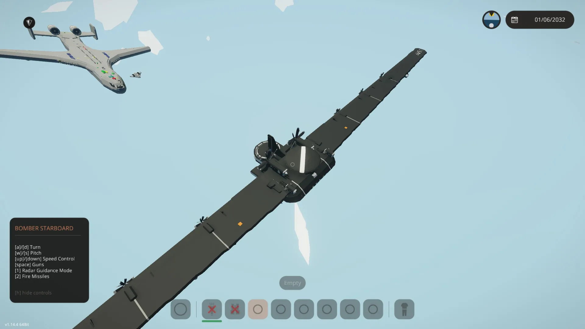 *When using the plane in combat. set a way point on the base you want to attack, and set that into your autopilot. Then activate the auto pilot and bomber mode switch. This will fly a 4000 meter high and ruffly 8Km circle around your target aria. At this point you are ready to start drone strikes. Go to the left or right side of the plane. The drones are controlled by the 2 hemispheres. The right since controls drones 1 and 2. While the left controls drones 3 and 4. Each hemisphere has access to 4 anti ship missiles. The 1 key will toggle dogfight mode. this will radar lock aircraft and ground targets to hold a 380 meter distance while zooming your camera and giving fine lead controls. Press the 3 key to fire anti ship missiles from the Dragon. The radar on the drone is used to aim these. Simple as that.