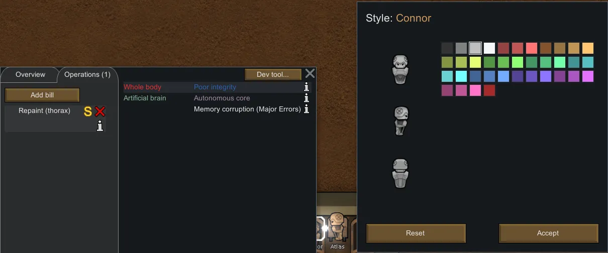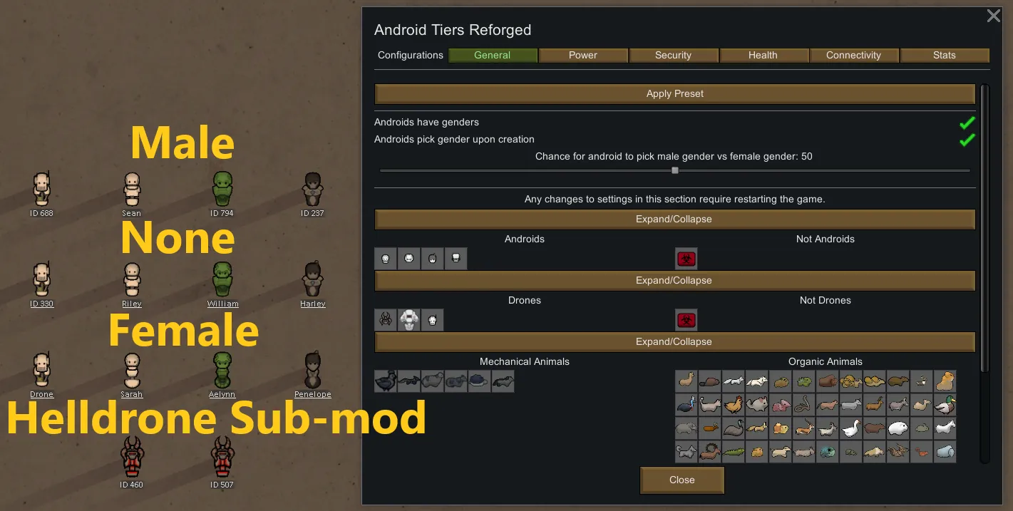 Android Tiers Reforged is a total rework of Atlas' and ARandomKiwi's works with the eventual goal to make mechanical colonists and animals as closely linked to RimWorld's core systems as possible while respecting many original mechanics of the mod. Improved performance, dynamic compatibility, and code formatting are key priorities, and the code has undergone a near-complete rewrite across the board to these ends.