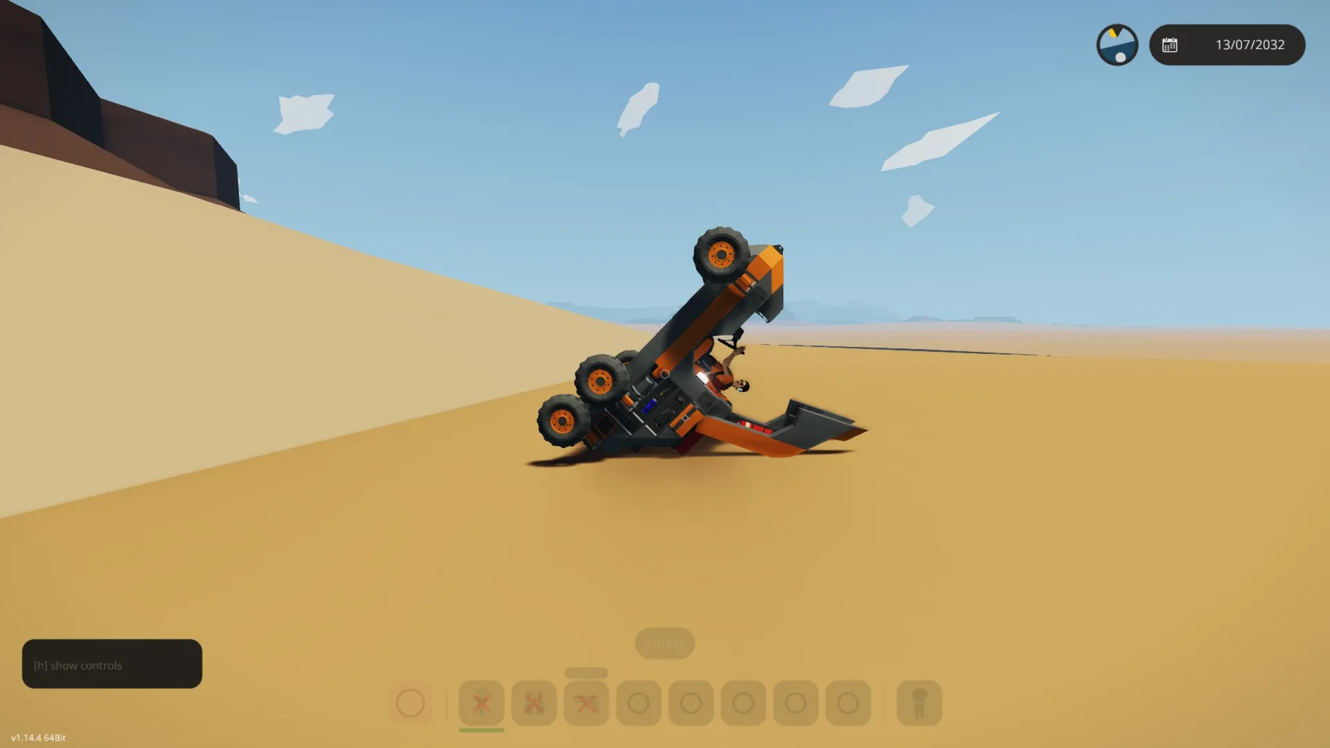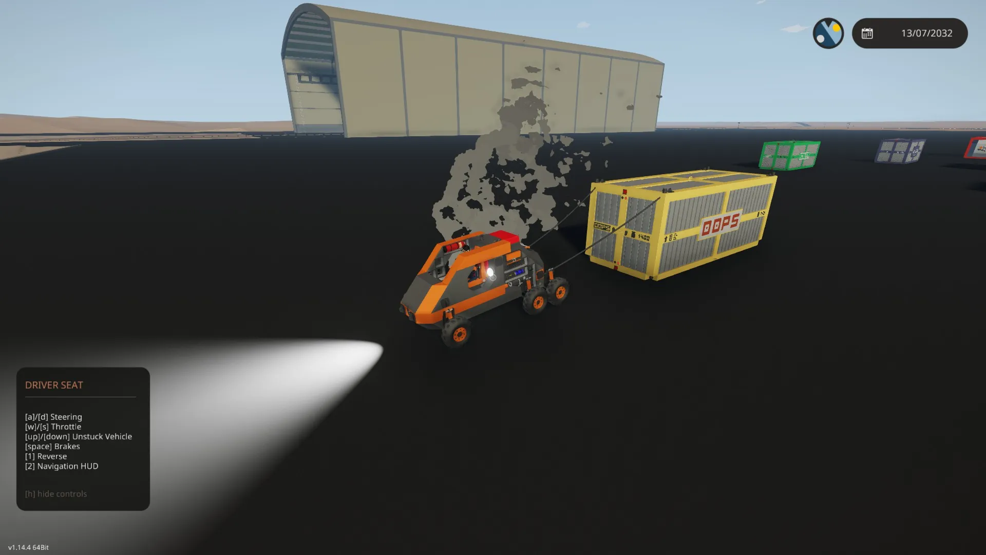 - When turned on the side, try to put it on the roof: Take a rope and attach it on the rope anchor in the middle on the side (the only one facing up). Walk backwards where the roof faces until reached rope max length. Then, gently pull on it, to rotate it on the roof. Enter the driver seat and use the arrows to turn the vehicle back on the wheels.