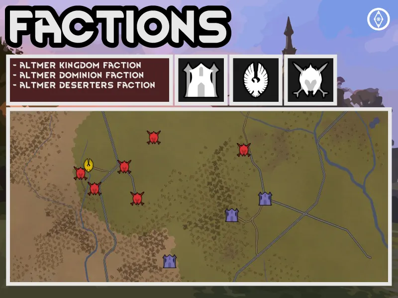This mod includes three Altmer factions: Kingdom, Dominion, and Deserters. Each fulfilling one of the standard vanilla faction archetypes.