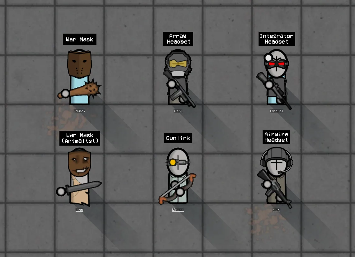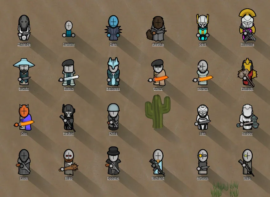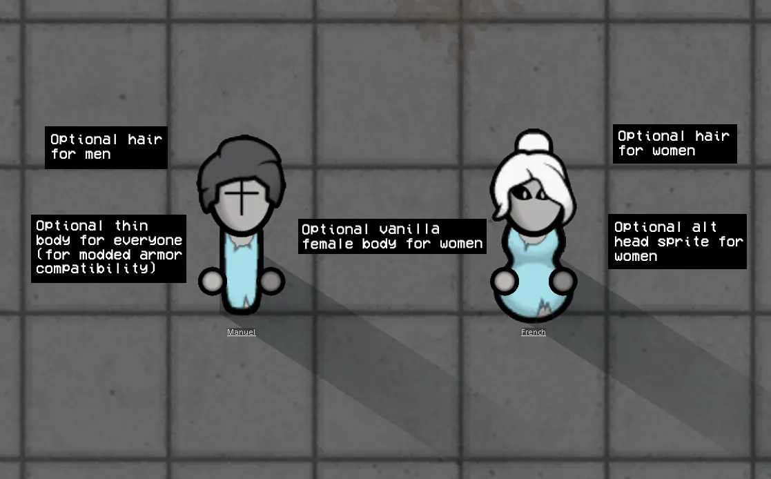 Makes RimWorld's human pawns look like grunts from Madness Combat. Everyone will have the same body and head type, with no hair (but beards remain). Bodily apparel has been retextured to accommodate that.